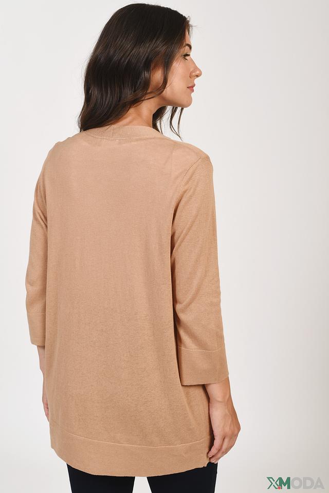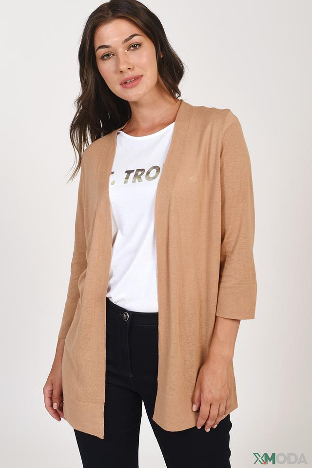 Жакет имеет прямой крой, который обеспечивает комфортную посадку по фигуре. Рукава длиной 3/4 делают его идеальным для теплой погоды. Отсутствие застежки позволяет носить его нараспашку, создавая непринужденный образ.