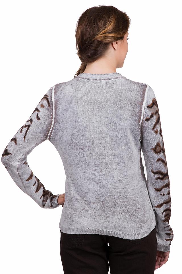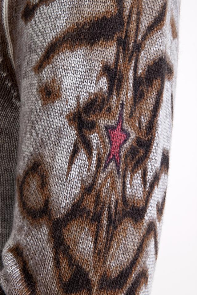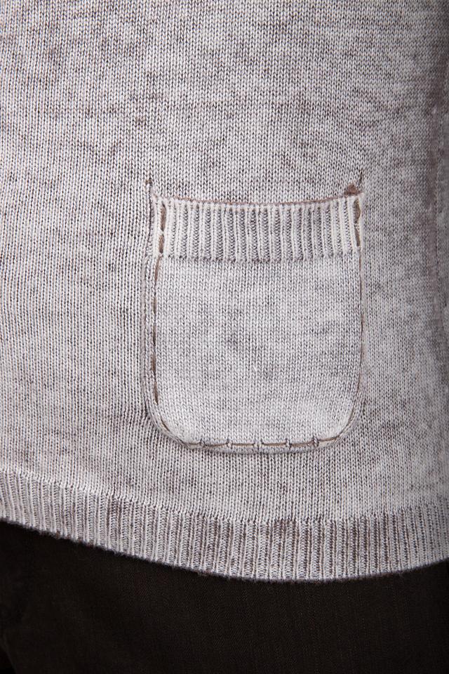 Кардиган имеет серый цвет с интересным узором на рукавах, который добавляет ему оригинальности. Застежка на пуговицы позволяет регулировать степень тепла и создавать разные силуэты. На груди расположен удобный накладной карман.