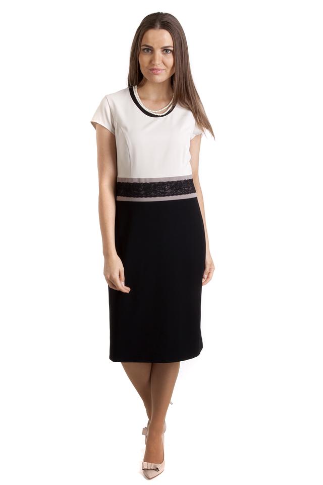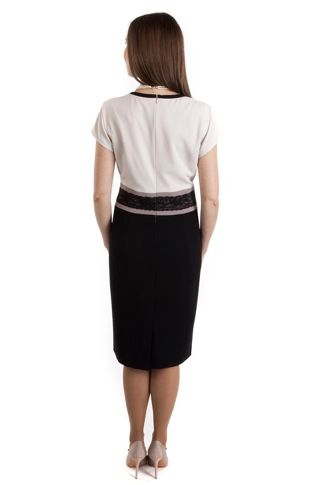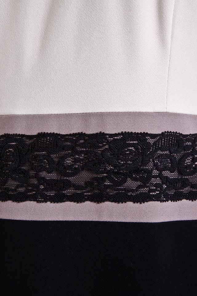 Верх платья выполнен из гладкой ткани молочного оттенка, а нижняя часть – из плотной чёрной ткани. Талия подчеркнута широкой вставкой из чёрного кружева, которая добавляет образу женственности и изысканности. Платье имеет короткие рукава и круглый вырез горловины.