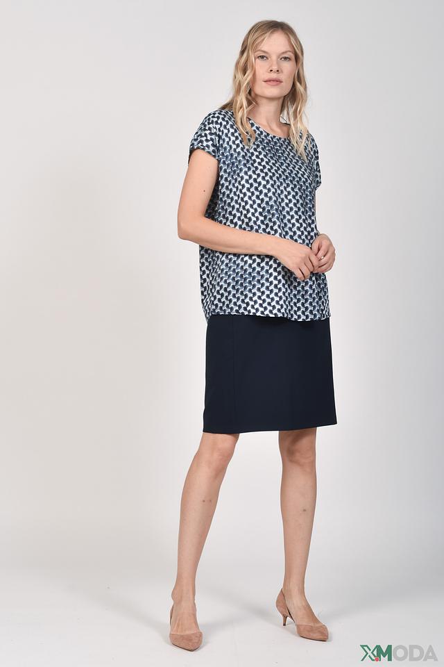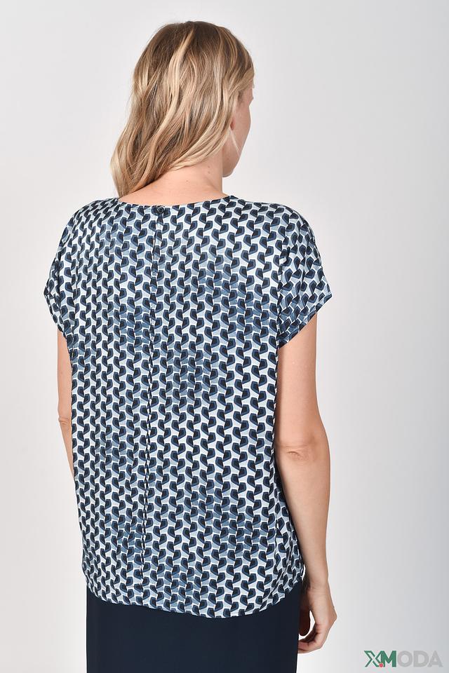Блуза имеет свободный крой, короткие рукава и округлый вырез горловины. Её украшает стильный геометрический принт в голубых и белых тонах, который придаёт ей особый шарм.