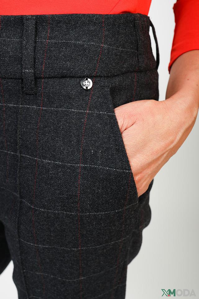 Детали кроя включают в себя пояс на пуговицах, боковые карманы и задние карманы с клапанами. Клетчатый узор добавляет брюкам изысканности и делает их универсальным элементом гардероба. Эти брюки идеально сочетаются с блузками, рубашками и жакетами, создавая стильные и элегантные комплекты.