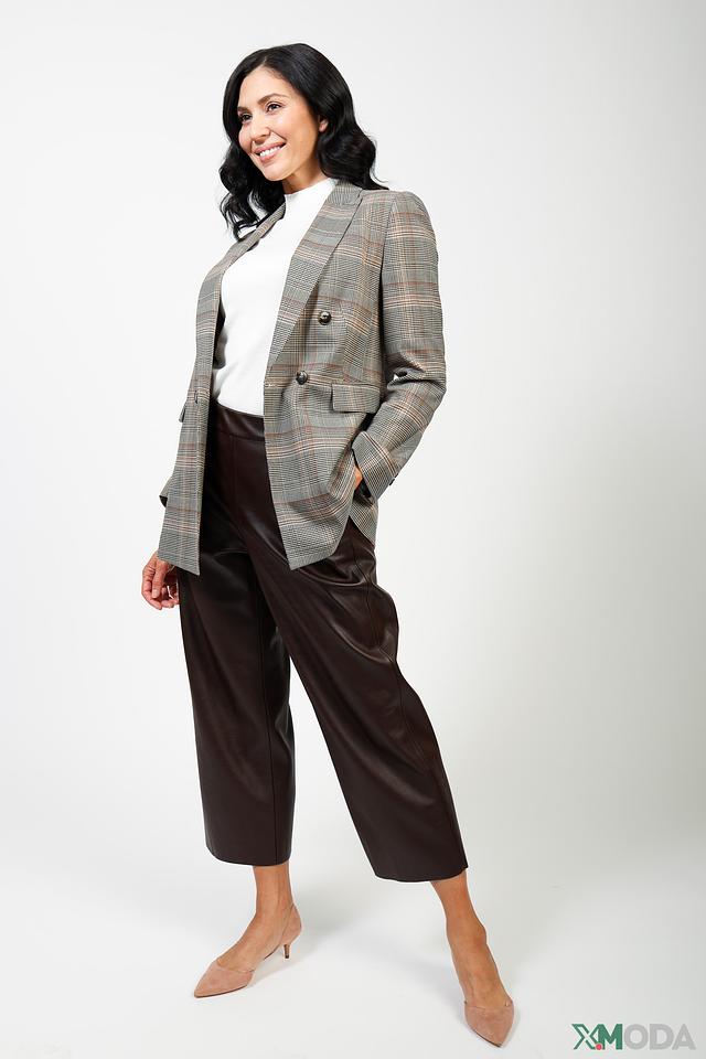 Жакет имеет прямой крой, который подходит для большинства типов фигур. Двубортная застежка с декоративными пуговицами подчеркивает талию и создает женственный силуэт. Длинные рукава с аккуратными манжетами дополняют образ.