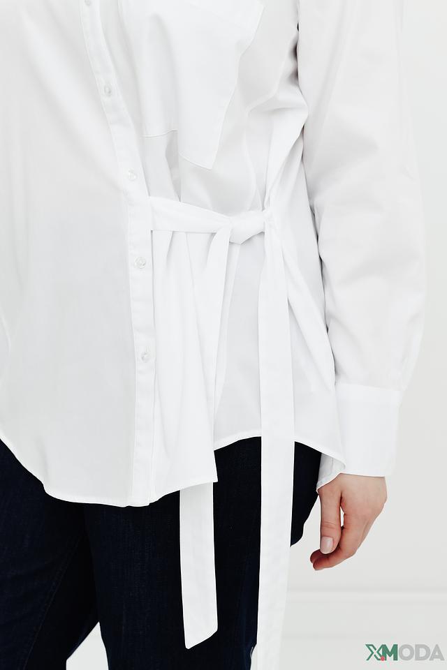 Рубашка имеет длинные рукава и стандартную посадку. Отличительной особенностью модели является акцентный пояс-завязка, который позволяет подчеркнуть талию и создать более женственный силуэт. Застежка на пуговицах по всей длине обеспечивает удобство надевания и снятия.