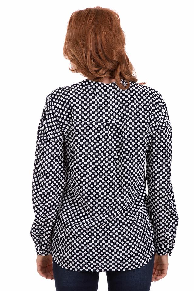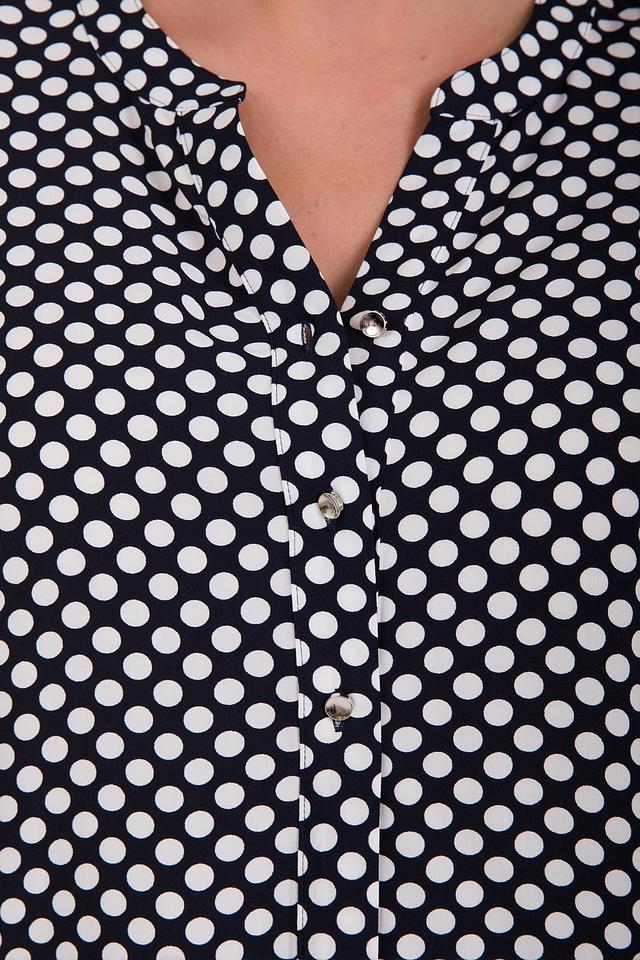 Блуза имеет классический крой с длинными рукавами и V-образным вырезом. Передняя часть блузы застегивается на ряд аккуратных пуговиц. Основной цвет блузы – черный, а рисунок представлен в виде мелкого белого горошка, что придает ей игривость и женственность.