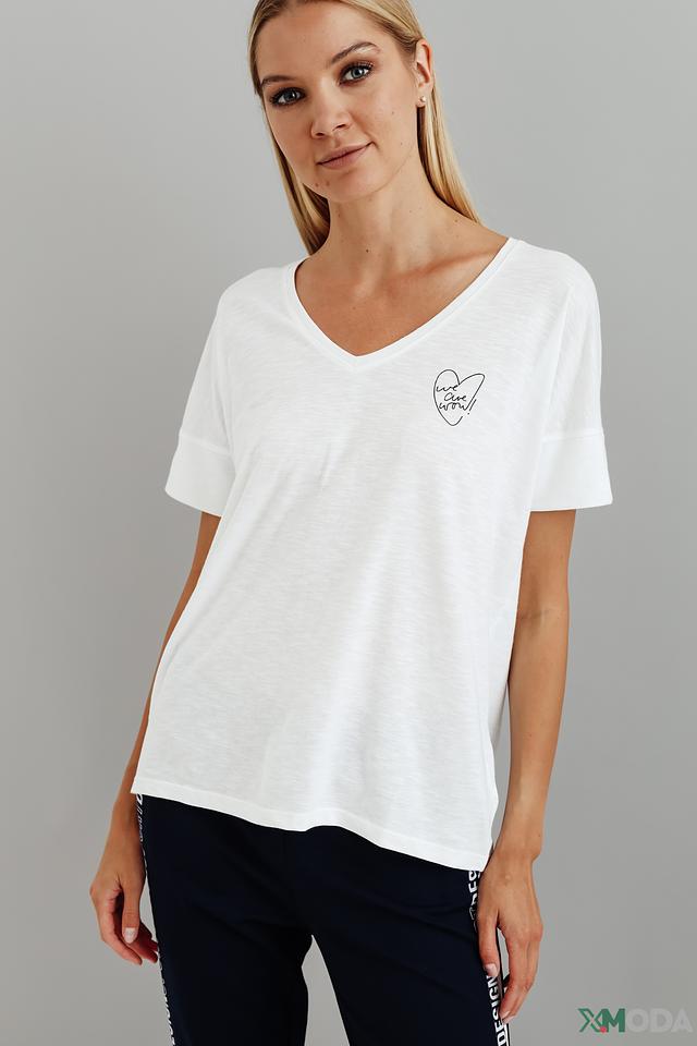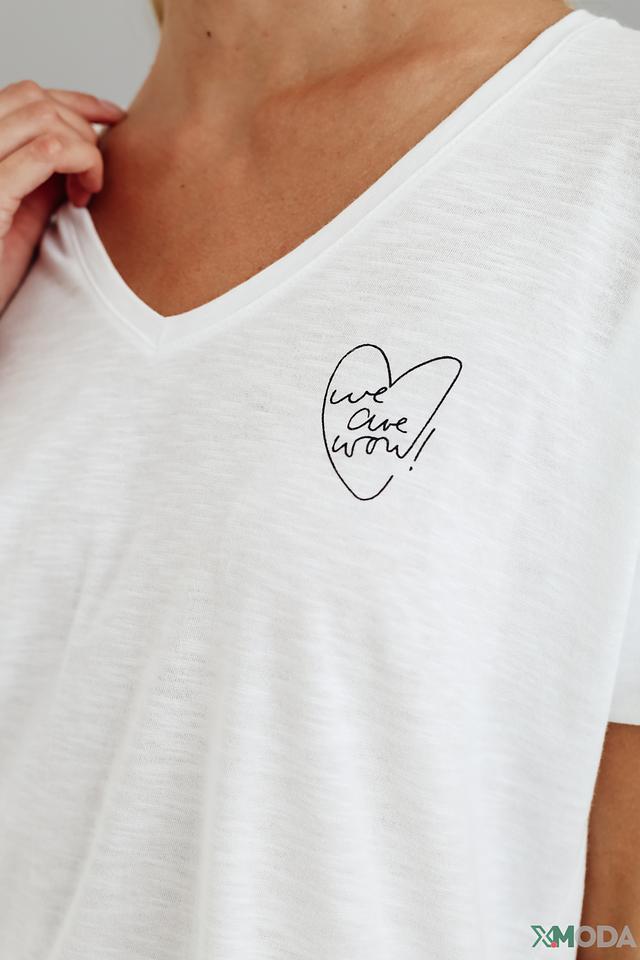 Модель имеет прямой крой, V-образный вырез и короткие рукава с небольшим отворотом. Футболка украшена вышивкой в виде сердца с надписью "we love you!" на груди, что придает ей особый шарм.