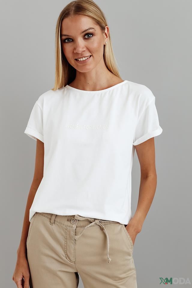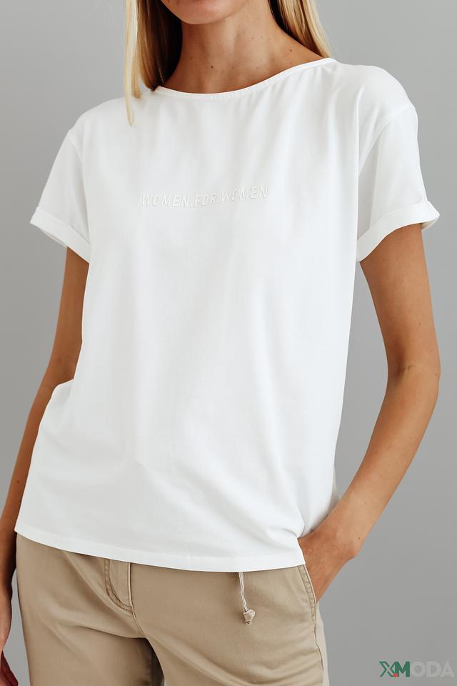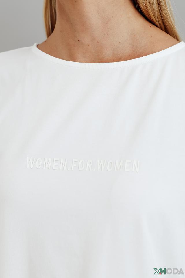 Футболка имеет прямой крой, круглый вырез горловины и короткие рукава с небольшим подворотом. На передней части футболки размещена надпись "WOMEN FOR WOMEN", выполненная в тон ткани.