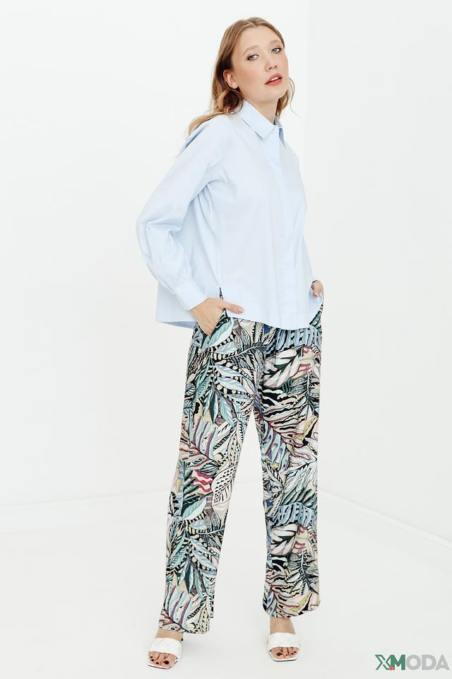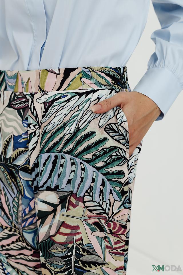 Брюки отличаются широким кроем и высокой посадкой, что обеспечивает свободу движений и подчеркивает талию. Главная особенность – эффектный принт с изображением тропических листьев в разнообразных оттенках: зеленого, синего, розового и бежевого.
