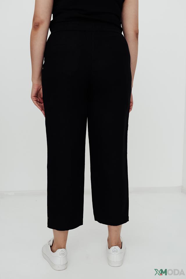 Классический чёрный цвет делает эти капри универсальными и легко сочетаемыми с различными элементами одежды. Прямой крой обеспечивает свободу движений, а эластичный пояс гарантирует удобную посадку по фигуре.