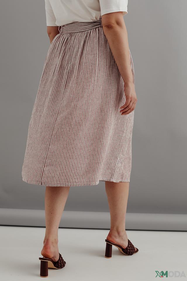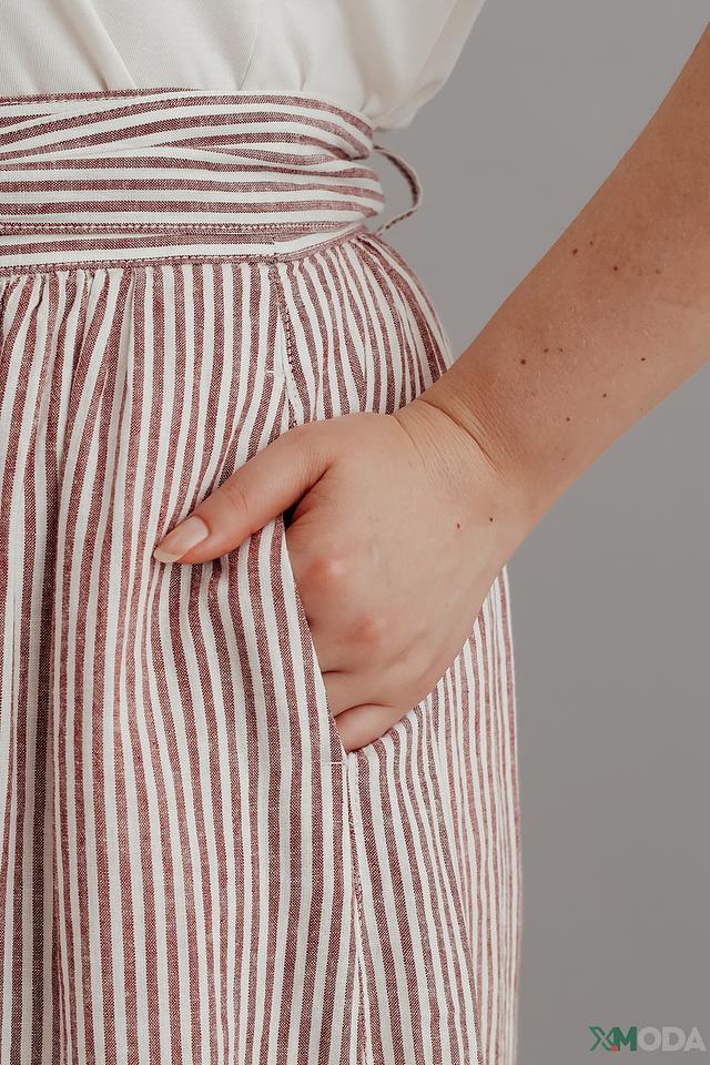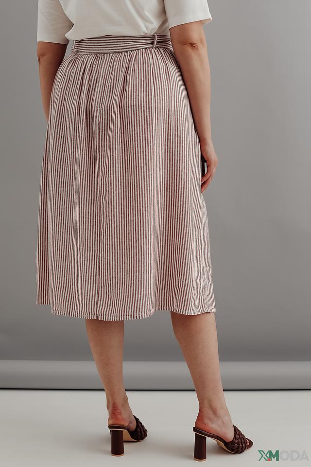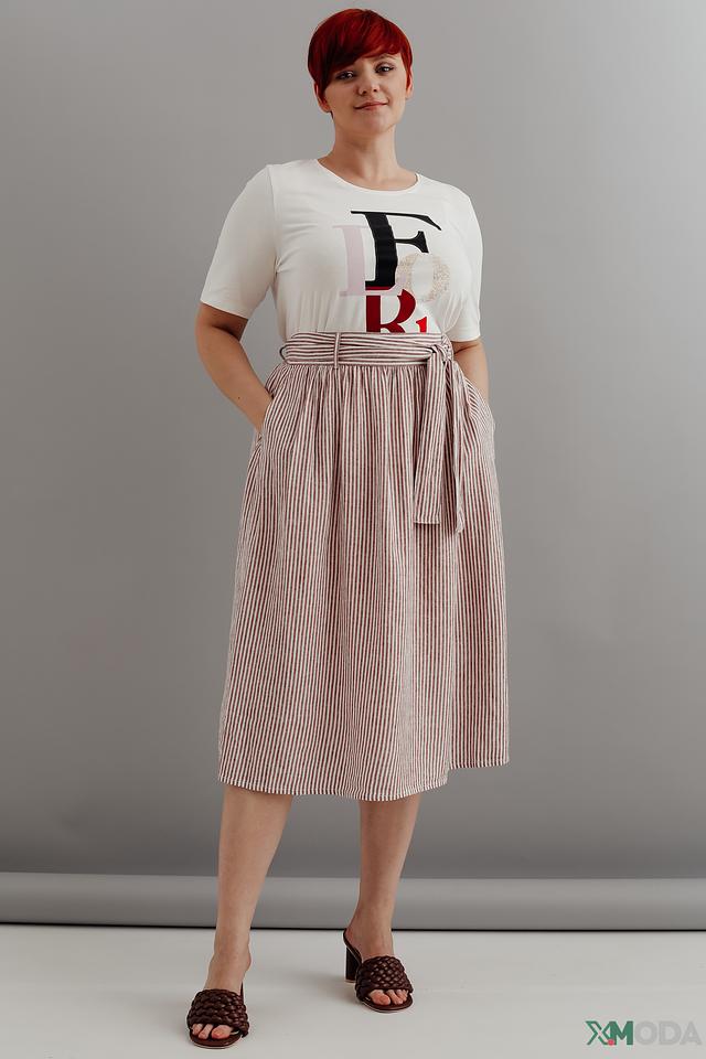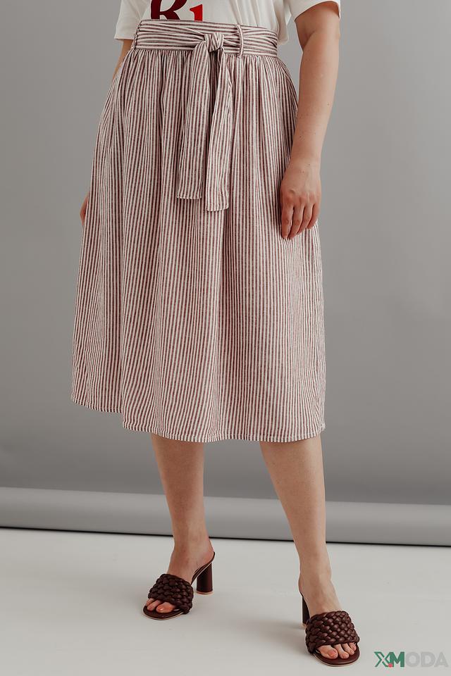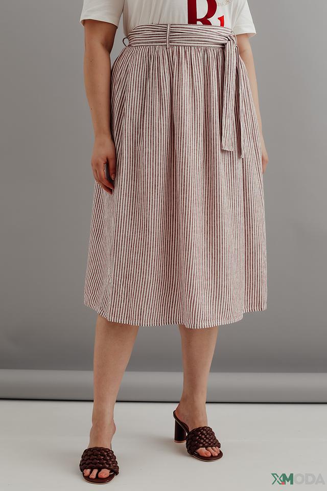 Юбка имеет классический А-силуэт и завышенную талию, подчеркивающую фигуру. Пояс позволяет регулировать посадку и создавать различные образы. Вертикальная полоска визуально стройнит и добавляет элегантности.