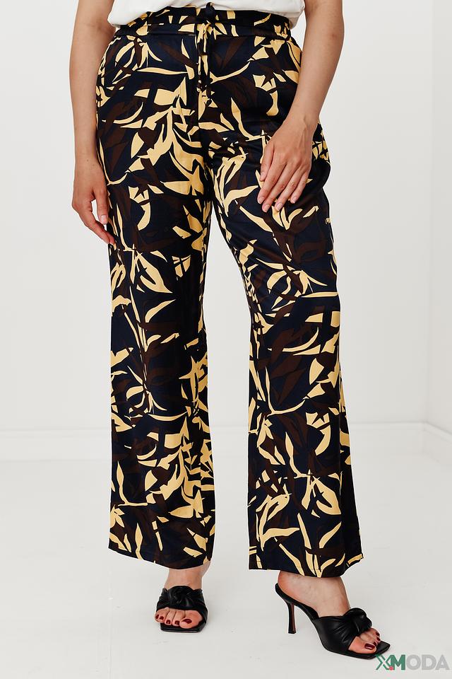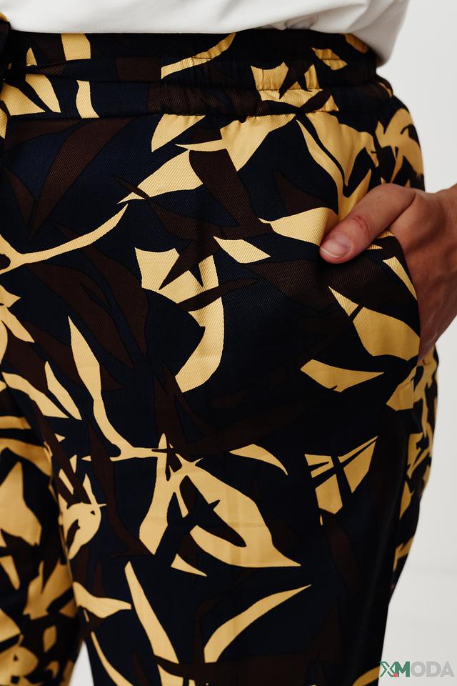 Особенностью модели является яркий цветочный принт, сочетающий в себе оттенки черного, желтого и коричневого. Прямой крой и классическая посадка делают брюки универсальными и подходящими для различных типов фигуры.