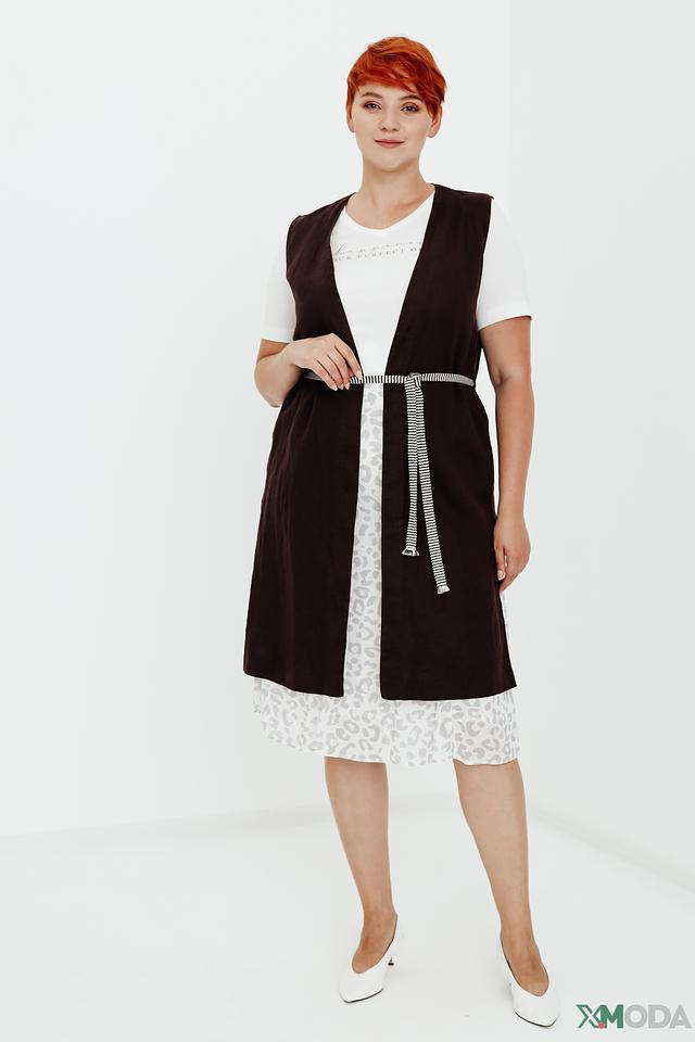 Жилет имеет удлинённый крой, который визуально вытягивает силуэт и делает образ более элегантным. V-образный вырез подчеркивает зону декольте.