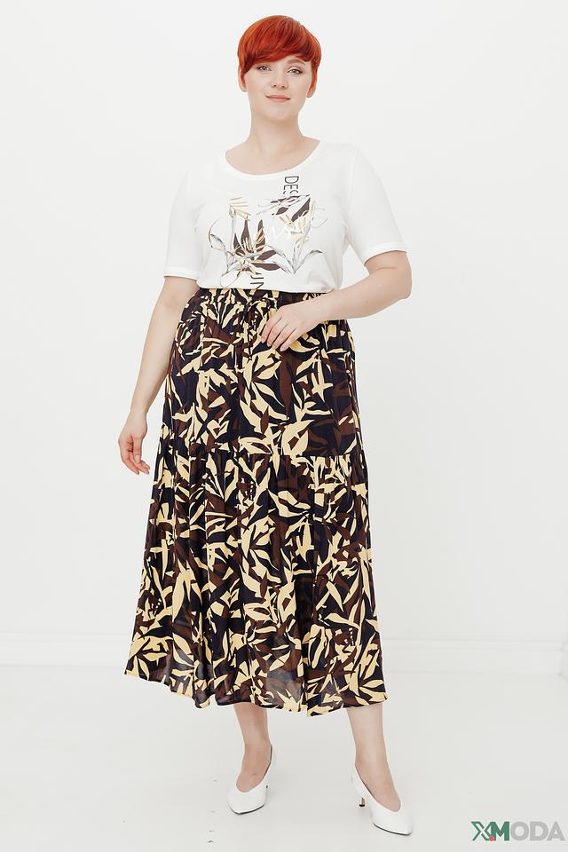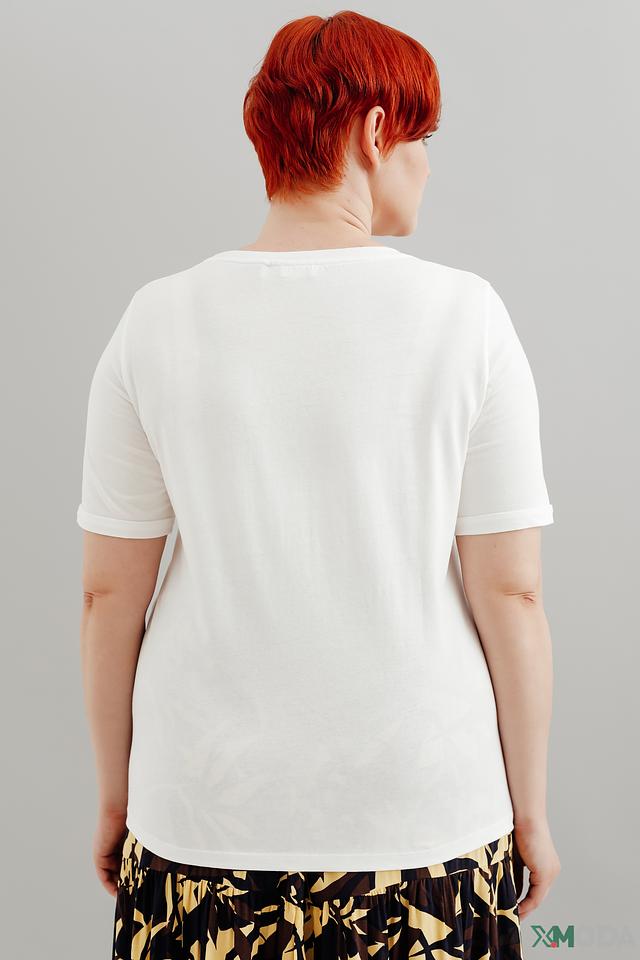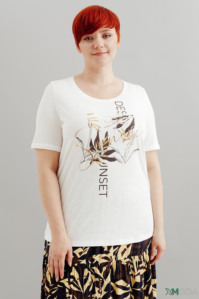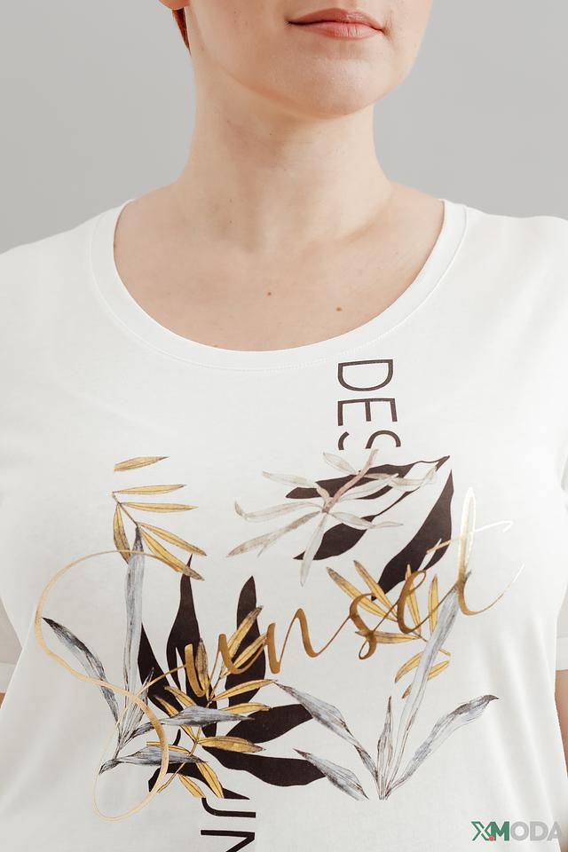 Футболка имеет прямой крой и короткие рукава, что обеспечивает свободу движений и комфорт в жаркую погоду. Округлый вырез горловины подчеркивает женственность силуэта.
