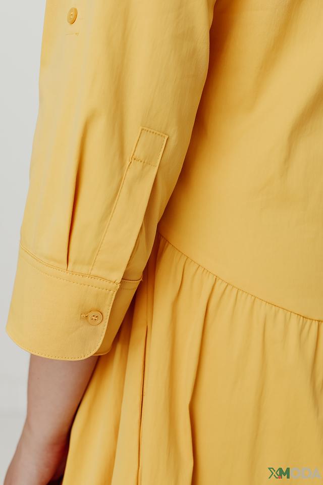 Платье имеет прямой крой, V-образный вырез горловины и застёжку на пуговицы по всей длине. Рукава длиной три четверти добавляют образу элегантности. Свободный силуэт не сковывает движений и обеспечивает комфорт в течение дня.