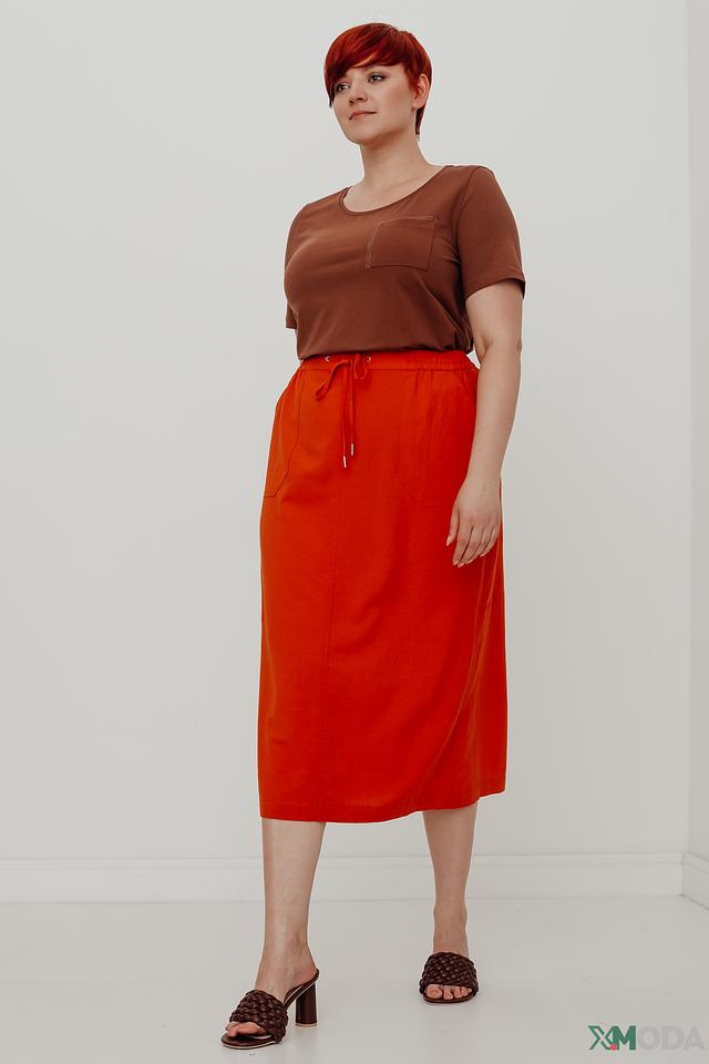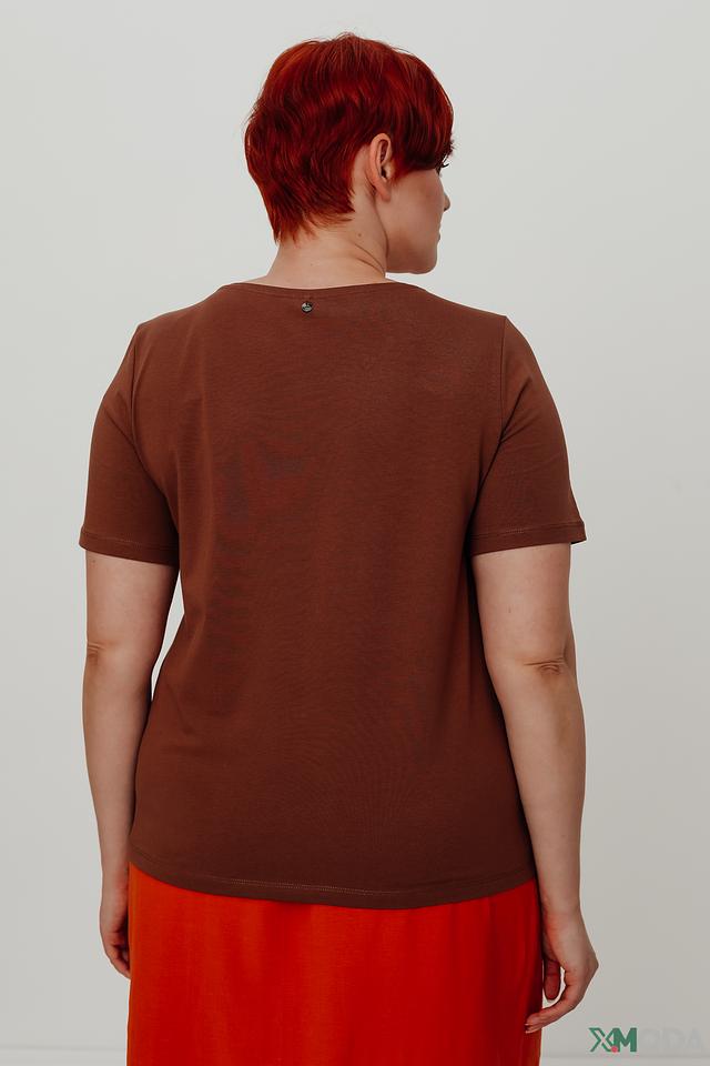Футболка имеет классический прямой крой и короткие рукава. Особенностью модели является небольшой накладной карман на груди, украшенный декоративной вышивкой. Выразительный коричневый цвет делает эту футболку универсальной и легко сочетаемой с различными элементами одежды.