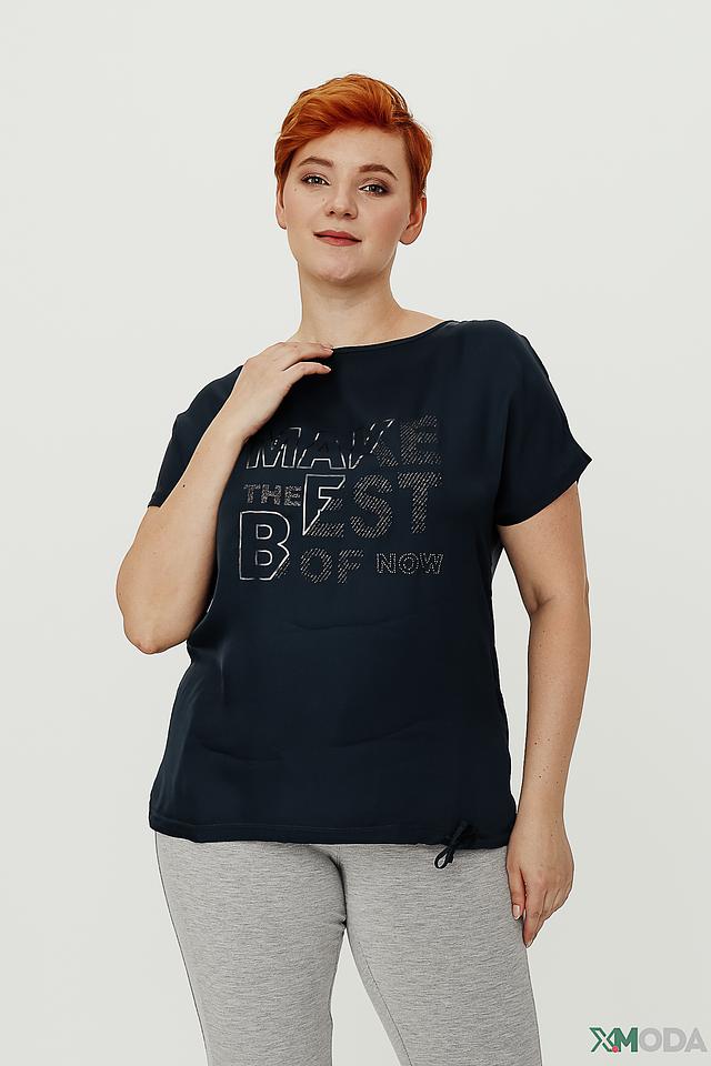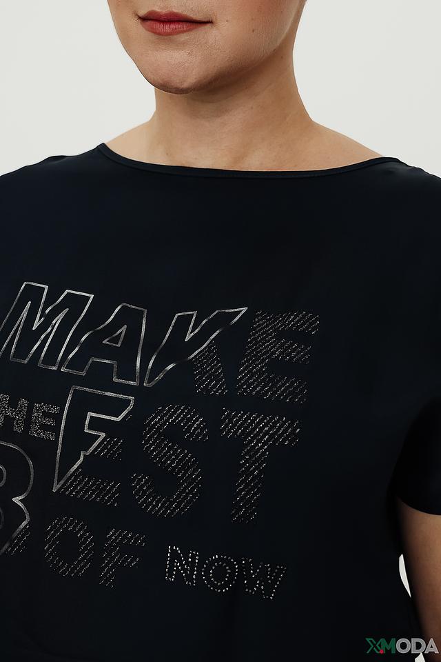 Модель имеет прямой крой, короткие рукава и округлый вырез горловины. Передняя часть блузы украшена эффектным принтом с надписью, выполненным в сером цвете с серебристыми акцентами.