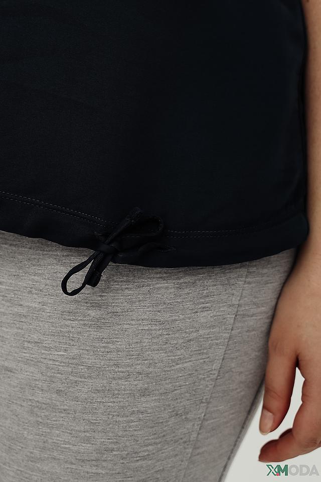 Блуза изготовлена из высококачественной вискозы (95%) с добавлением эластана (5%), что обеспечивает приятные тактильные ощущения, хорошую посадку по фигуре и лёгкость в уходе. Сбоку на подоле предусмотрена небольшая декоративная петля с шнурком, добавляющая образу динамичности.