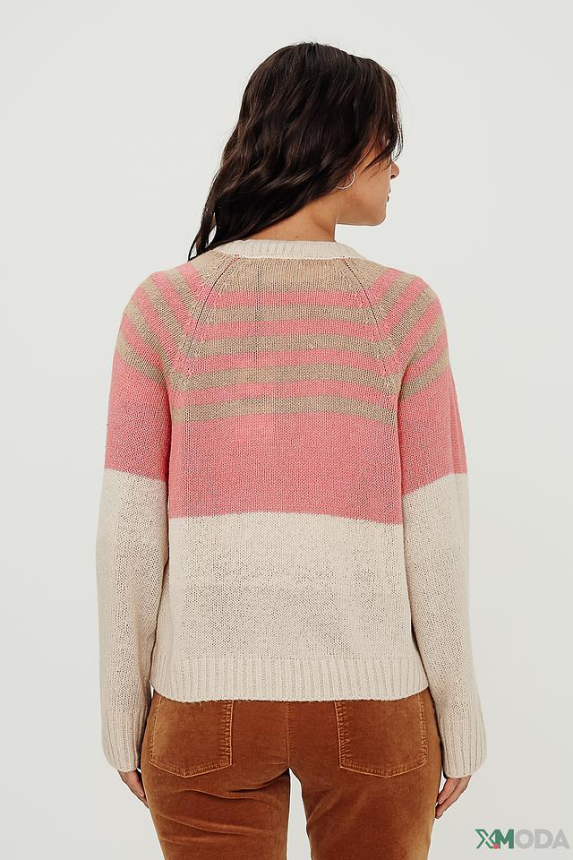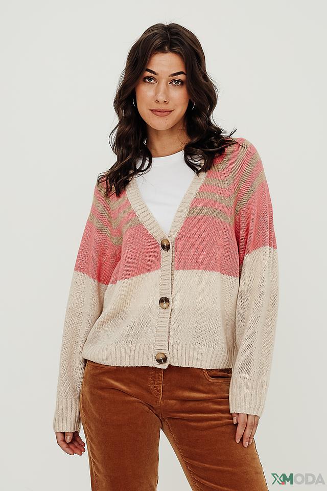 Кардиган имеет свободный крой, который обеспечивает комфорт в носке. V-образный вырез и застежка на пуговицы позволяют регулировать степень открытости. Дизайн кардигана украшен горизонтальными полосами в нежных оттенках розового, бежевого и серого, что придает ему особый шарм.