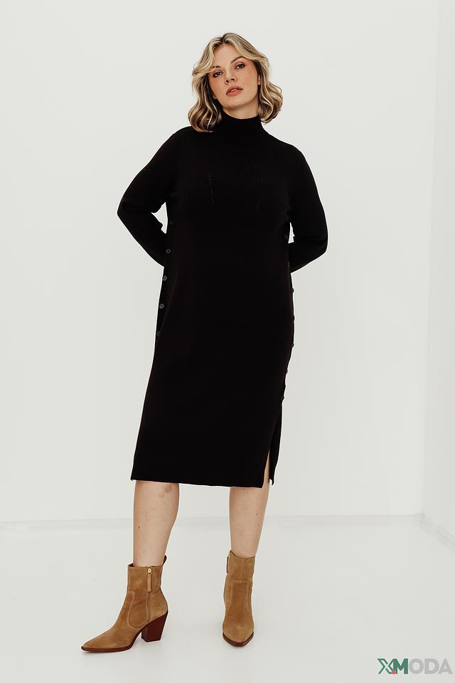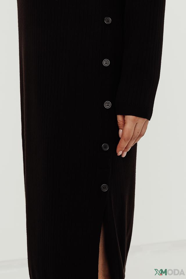 Модель имеет прямой силуэт и длину миди, что делает её универсальной для разных типов фигур. Высокий воротник и застёжка на пуговицы добавляют платью изысканности и позволяют регулировать степень открытости.
