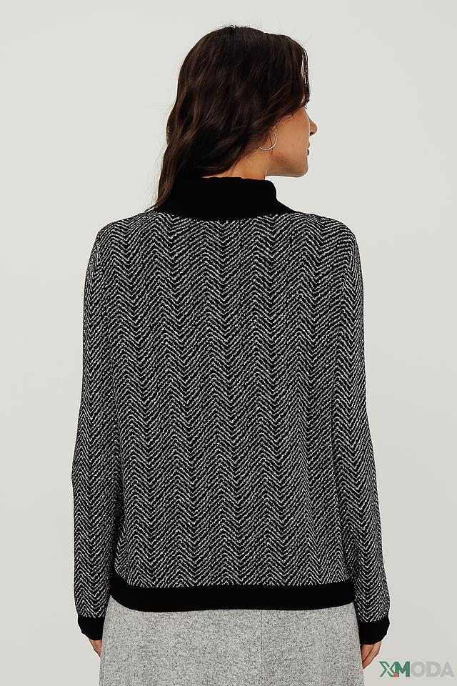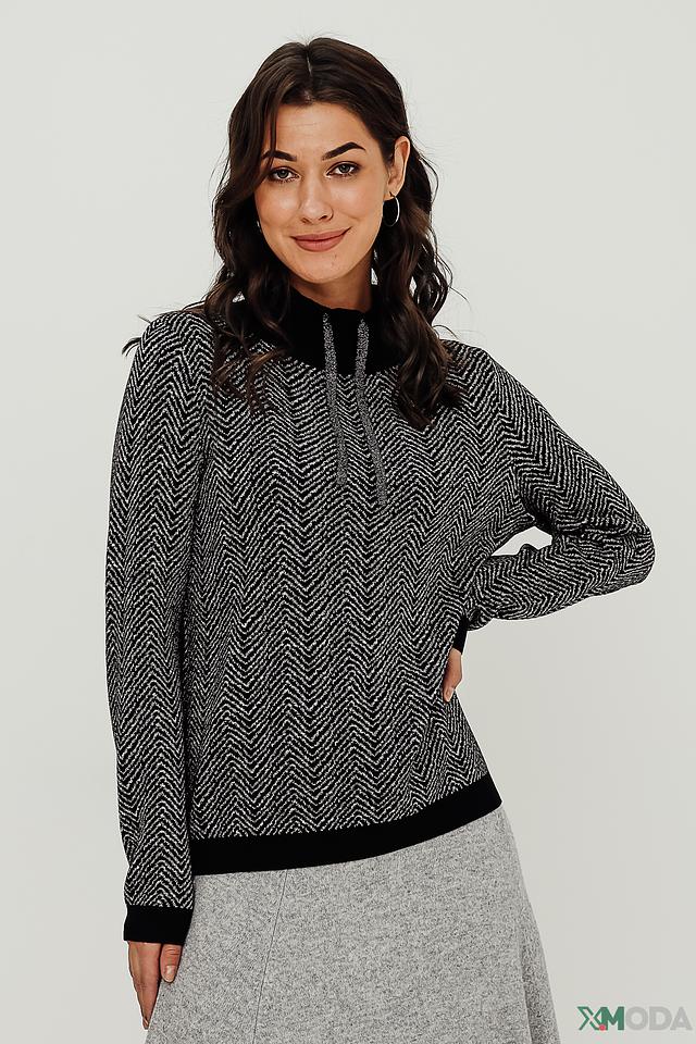 Женский пуловер Gerry Weber чёрно-белого цвета с геометрическим зигзагообразным узором. Модель с высоким воротником-стойкой и небольшим разрезом с завязками. Изготовлен из мягкой вискозы с добавлением полиэстера и металлизированных волокон. Состав: вискоза 50%, полиэстер 30%, металлизир. волокно 20%