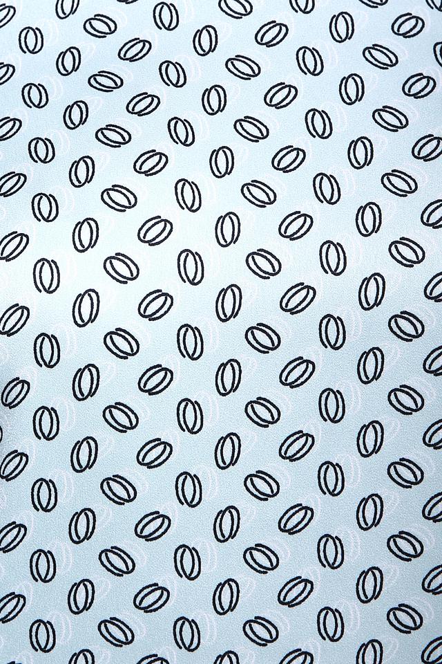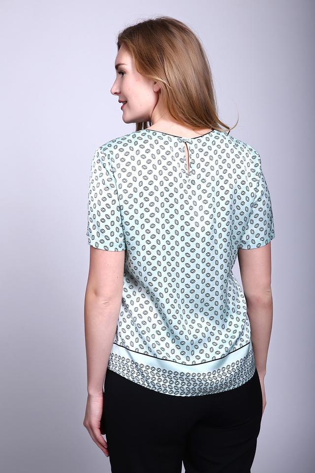 Блуза имеет прямой крой и короткие рукава, что обеспечивает свободу движений. Округлый вырез горловины придает ей классический вид. Основной цвет блузы – светло-голубой, а ее поверхность украшен мелким принтом в виде черных овалов, создающим интересный визуальный эффект.