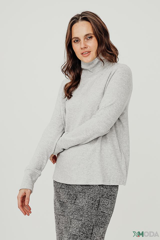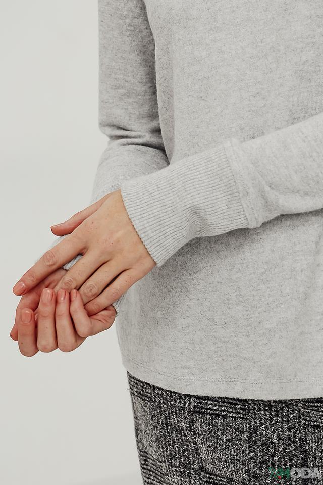 Водолазка имеет классический крой с длинными рукавами и высоким воротом. Преобладающий цвет – серый, с легкой меланжированной текстурой. Такой оттенок легко сочетается с различными элементами одежды, позволяя создавать разнообразные стильные образы. Водолазка идеально подойдет для ношения как самостоятельно, так и в качестве базового слоя под пиджак или кардиган.