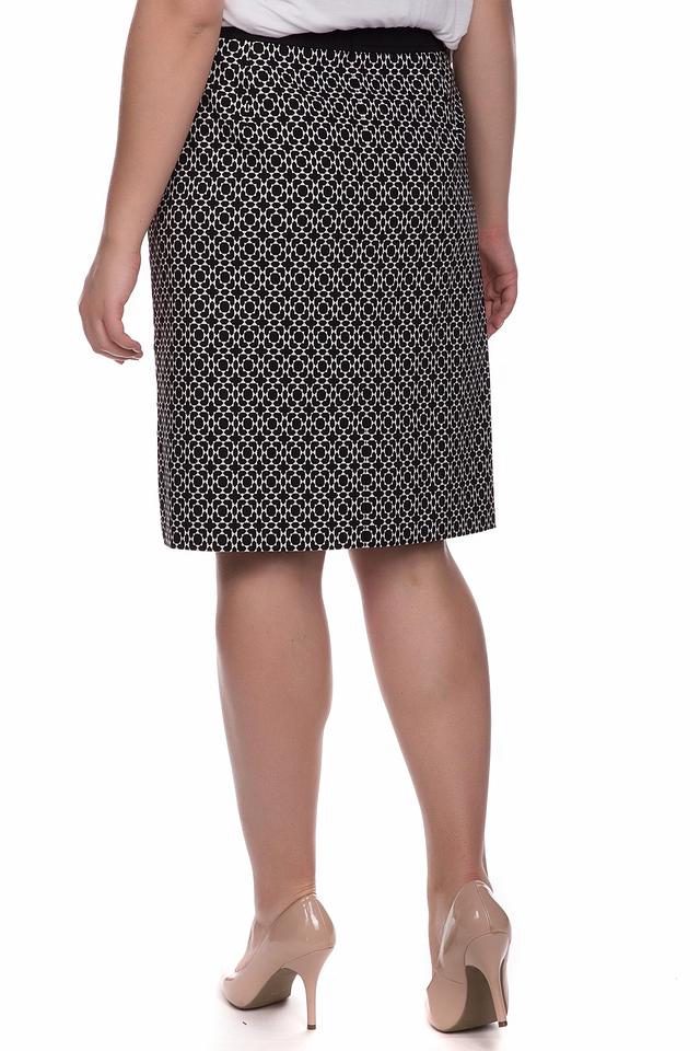 Основной цвет юбки – чёрный, но благодаря оригинальному белому геометрическому рисунку в виде мелких соединенных кругов, она выглядит свежо и интересно. Эластичный пояс обеспечивает комфортную посадку и свободу движений.