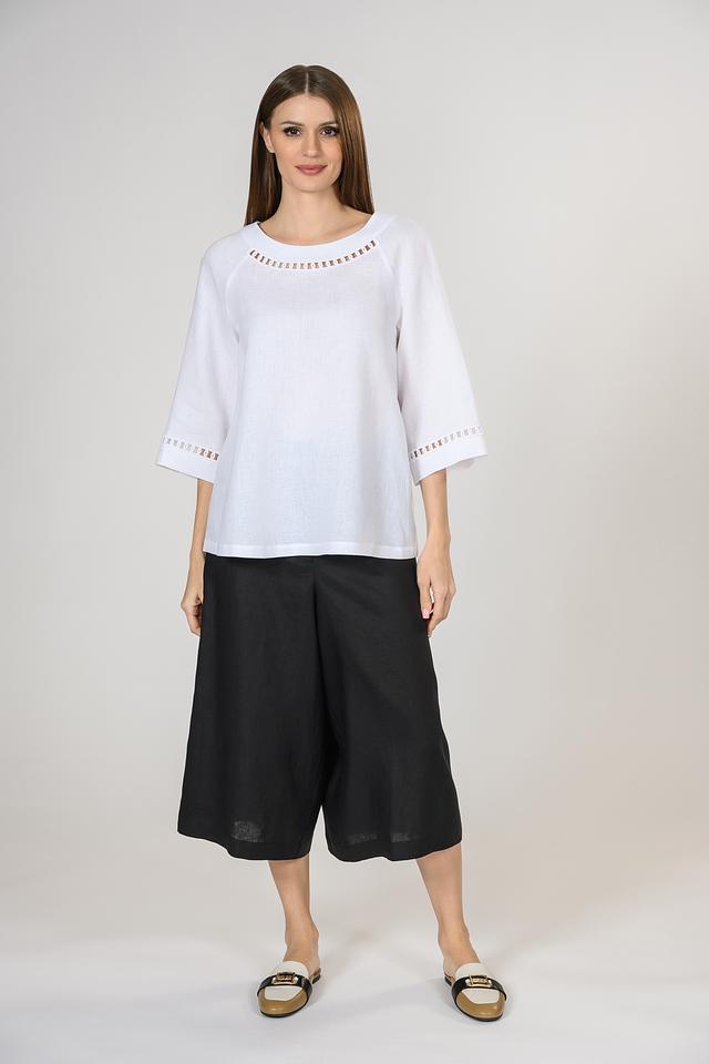 Блуза имеет свободный крой, который не сковывает движений и обеспечивает комфортную посадку по фигуре. Состав ткани – 100% лен, что гарантирует долговечность и простоту в уходе. Эта блуза станет отличным выбором для создания легких и стильных образов в теплый сезон.