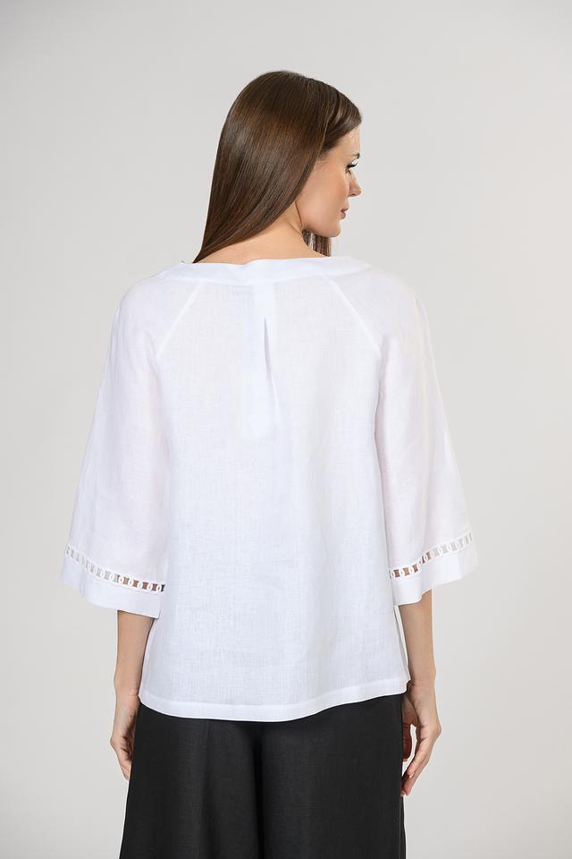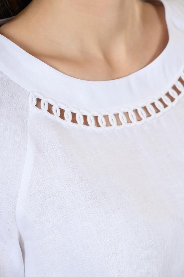 Особенностью данной модели является декоративная вышивка по горловине и на рукавах, придающая блузе изысканный и романтичный вид. Вырез горловины – округлый, а рукава – три четверти, что делает ее подходящей для повседневной носки.