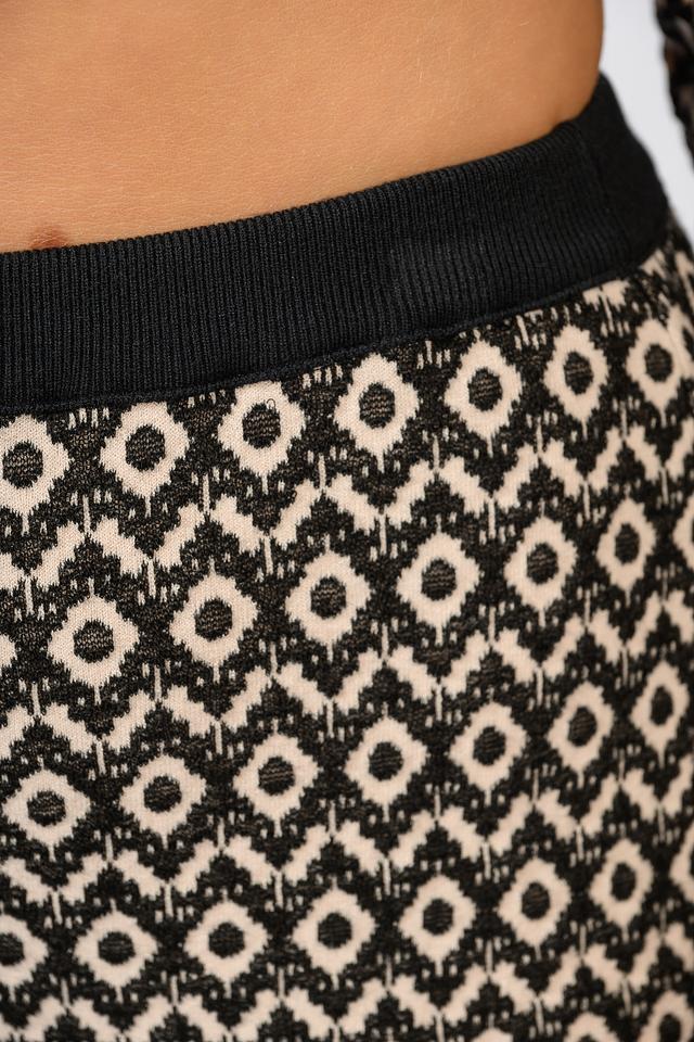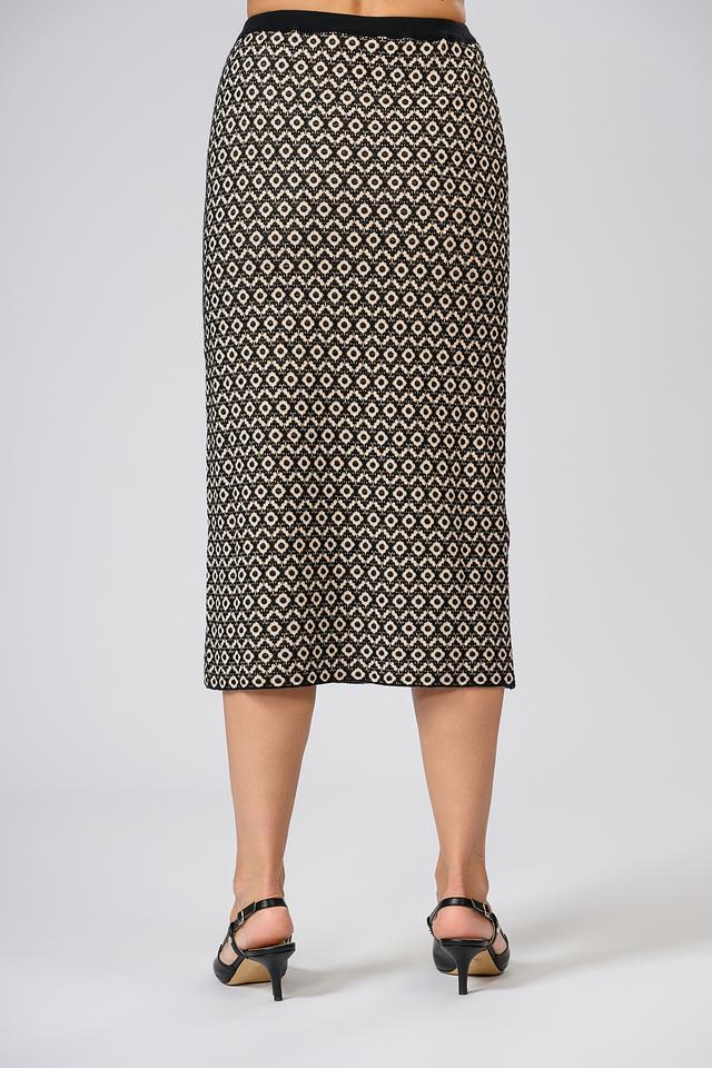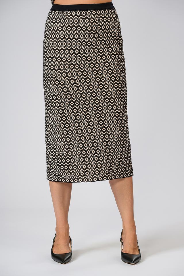 Юбка имеет прямой крой и длину миди, что делает её универсальной для различных случаев. Эластичный пояс обеспечивает комфортную посадку и подчеркивает талию. Чёрно-бежевый геометрический принт добавляет образу изысканности и стиля.