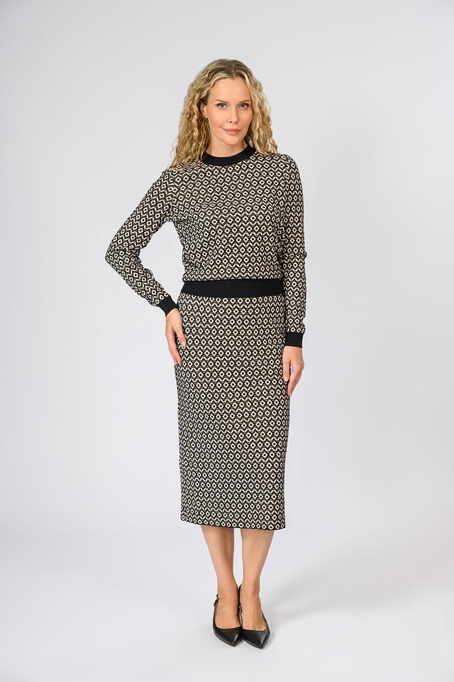 Юбка Giorgio Grati чёрно-бежевого цвета выполнена из мягкого трикотажа с геометрическим принтом. Прямой крой и эластичный пояс обеспечивают комфортную посадку по фигуре. Состав: вискоза 80%, полиэстер 12%, шерсть 8%