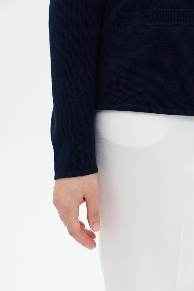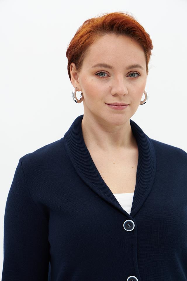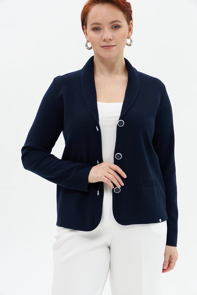 Жакет имеет тёмно-синий цвет, который легко сочетается с различными элементами одежды. Классический крой с отложным воротником и застежкой на три пуговицы придает модели элегантный вид.