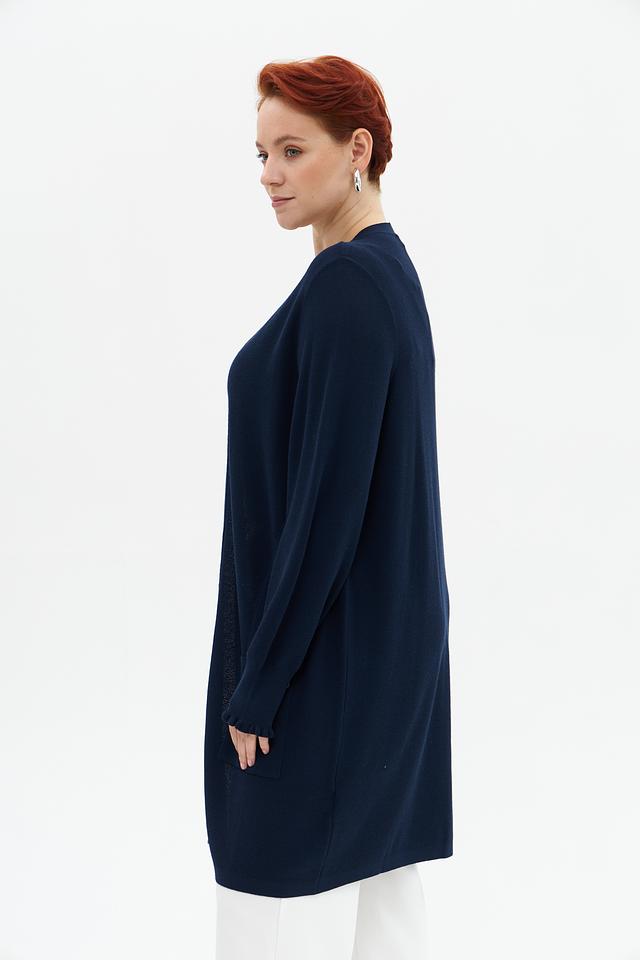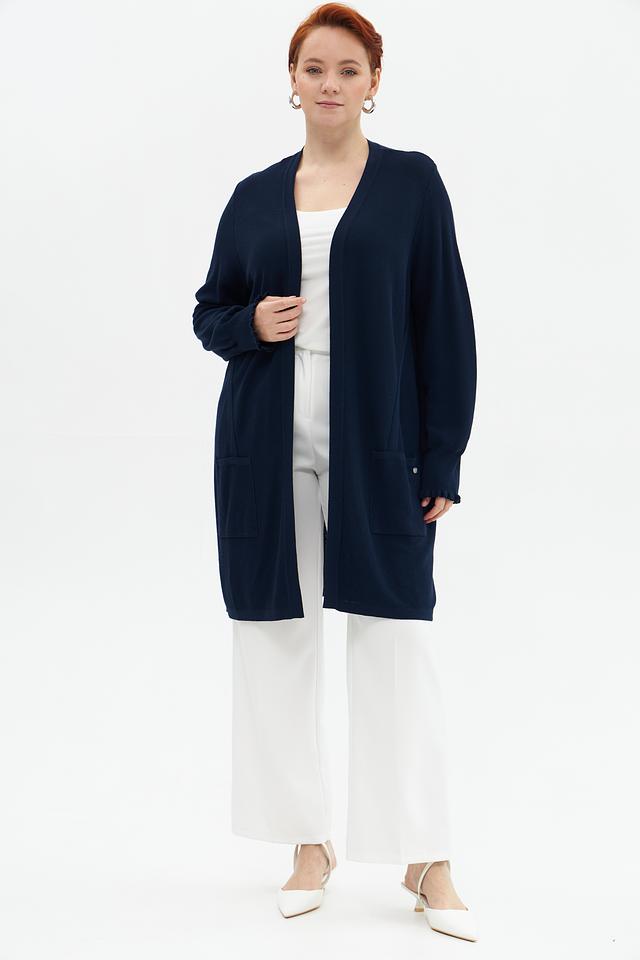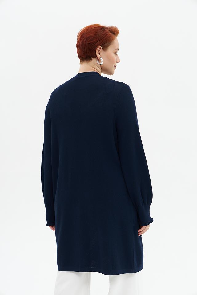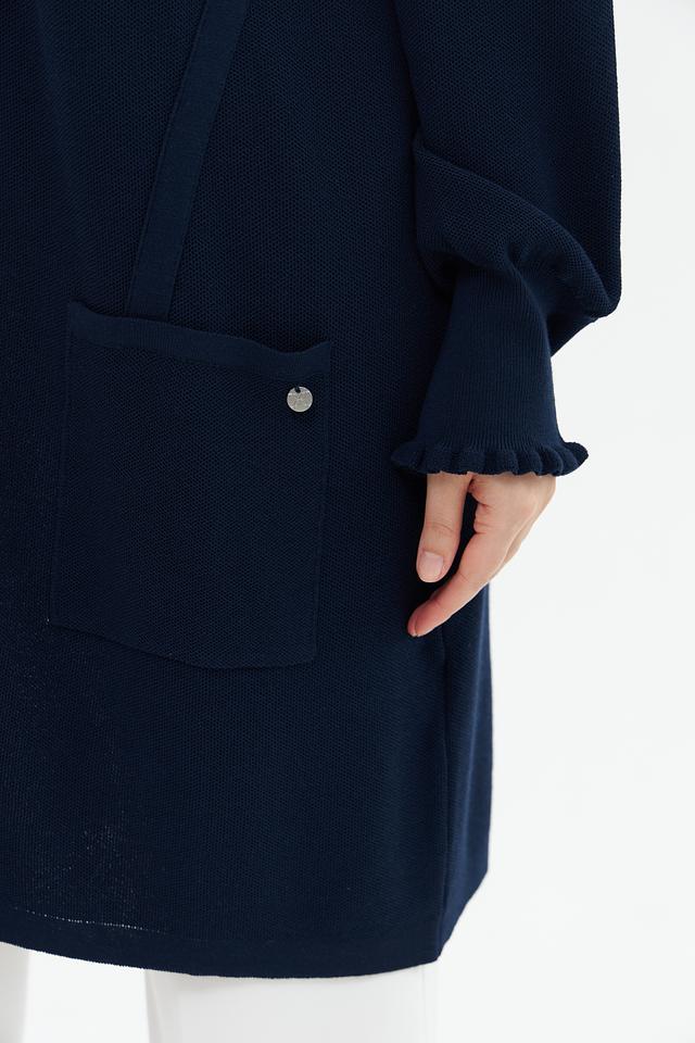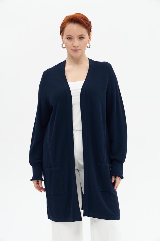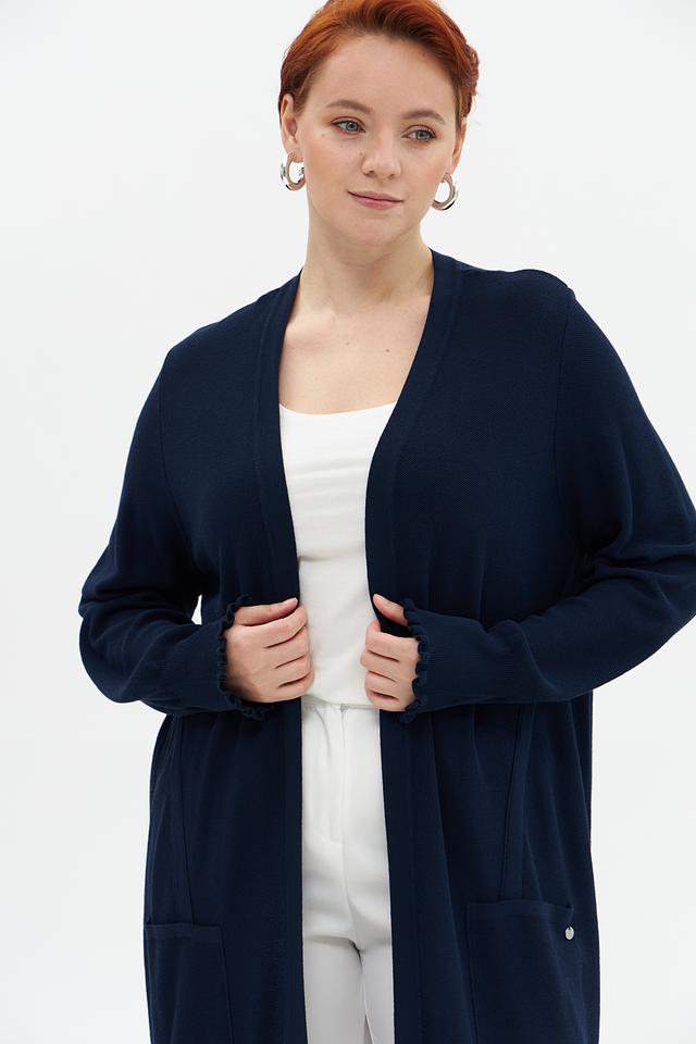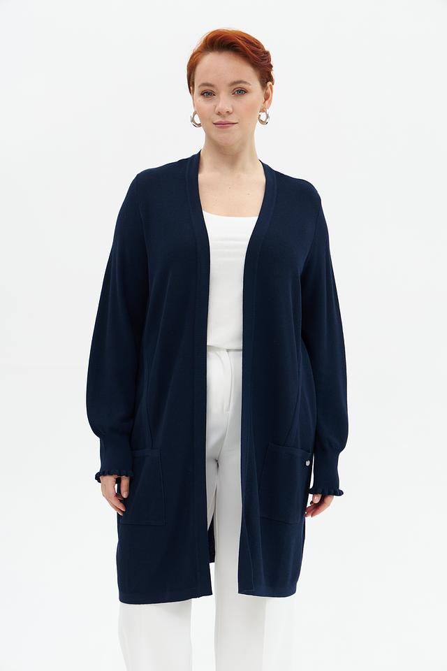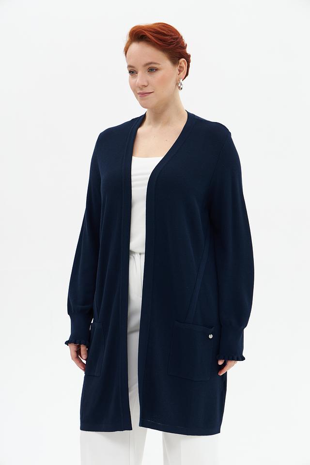 Жакет имеет V-образный вырез, длинные рукава с небольшим расширением к низу и два удобных кармана. Рукава отделаны декоративной рюшью, что придает изделию изящность.