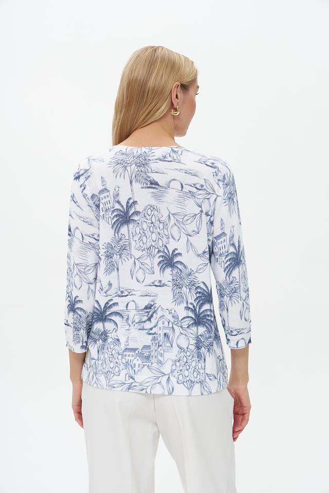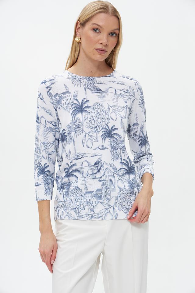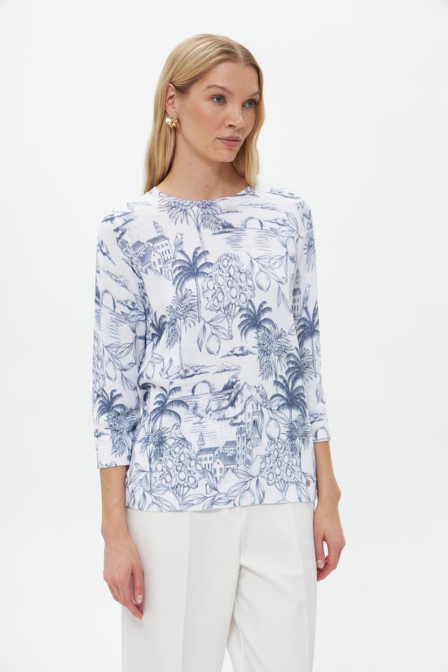 Пуловер имеет прямой крой и округлый вырез горловины. Его главная особенность – яркий и запоминающийся принт с изображением экзотических растений, архитектурных элементов и птиц, выполненный в голубых тонах на белом фоне.