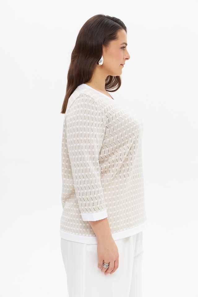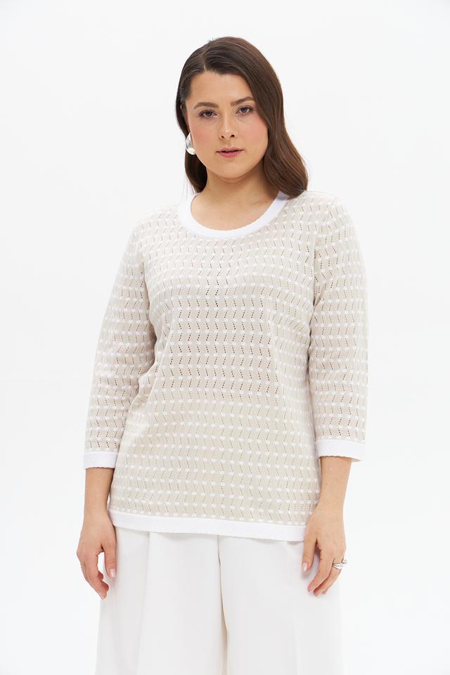 Модель имеет круглый вырез горловины, отделанный белой окантовкой, и рукава 3/4. Пуловер имеет свободный крой, который обеспечивает комфортную посадку по фигуре. Сочетание хлопка и полиакрила делает его приятным к телу и практичным в уходе.