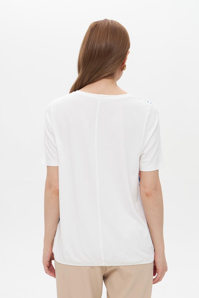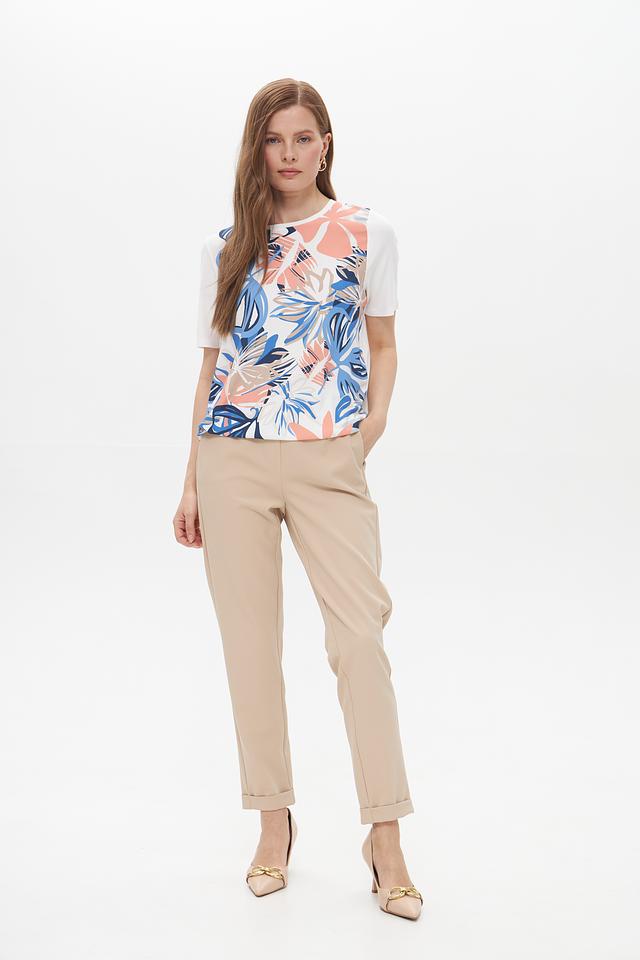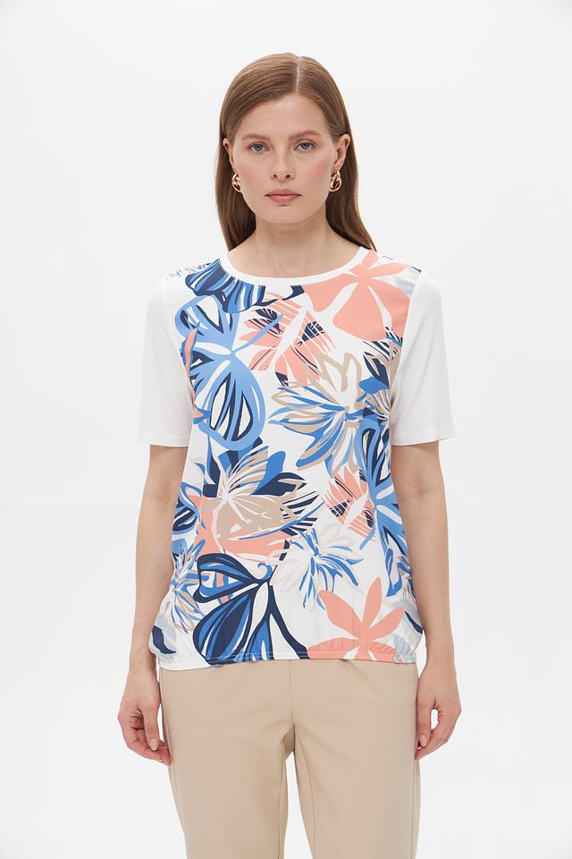 Основной цвет футболки – белый, а яркий тропический принт добавляет образу свежести и оригинальности. Рисунок включает в себя элементы синего, коричневого и розового цветов, создавая гармоничное сочетание.