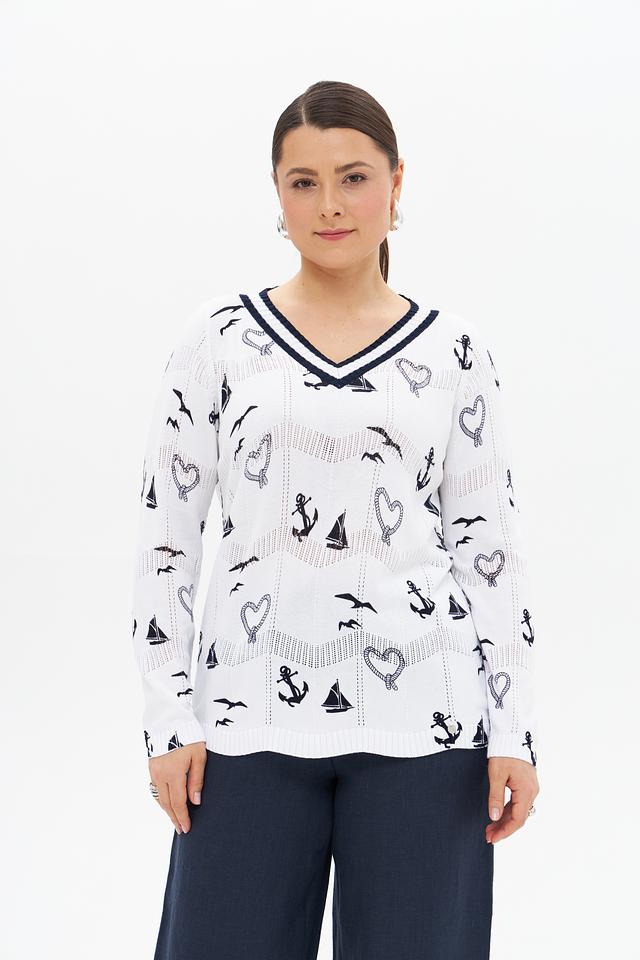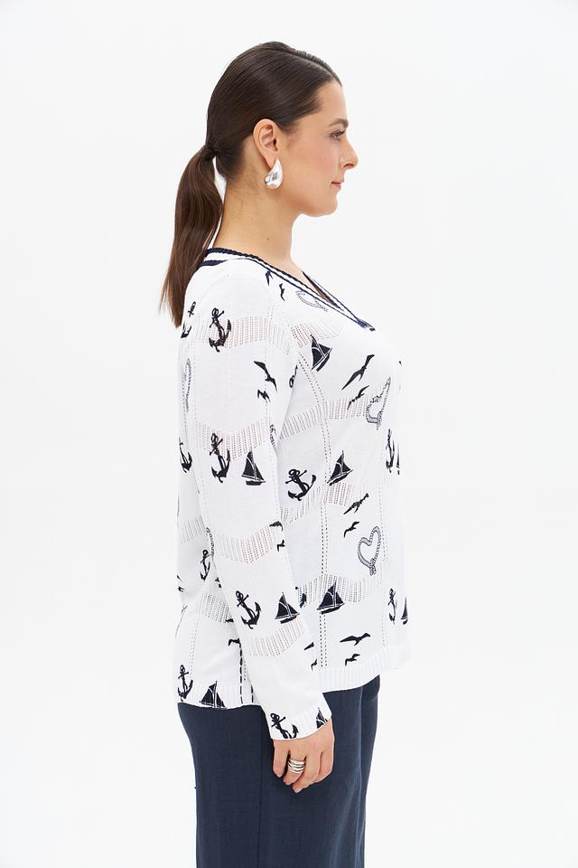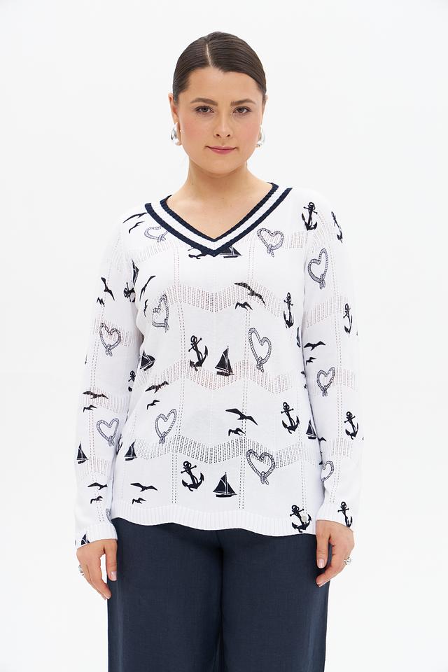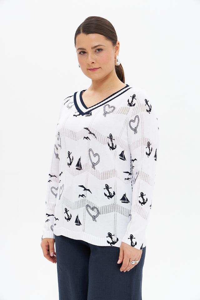 Белый пуловер Gollehaug с оригинальным морским принтом станет отличным дополнением к вашему гардеробу. Изготовлен из мягкой вискозы и хлопка, обеспечивая комфорт и удобство в носке. Стильный и лёгкий, идеально подходит для создания повседневных образов. Состав: вискоза 60%, хлопок 40%