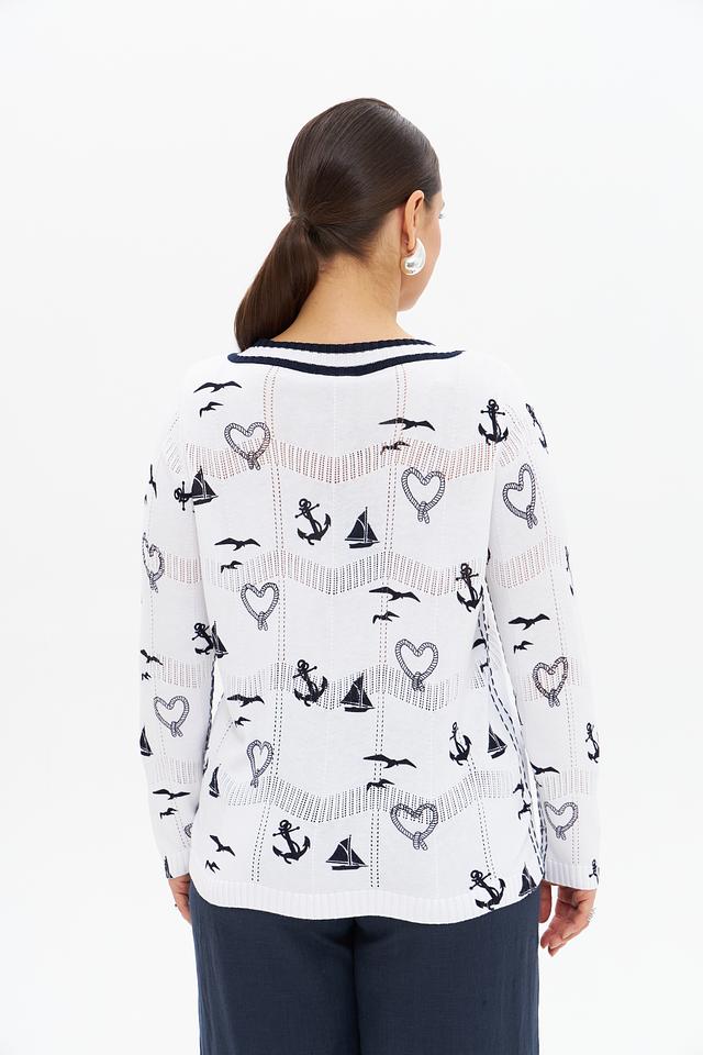 Этот пуловер от Gollehaug выполнен в белом цвете и украшен забавным принтом с морской тематикой: якорями, чайками и лодками. V-образный вырез и короткий рукав делают его идеальным для тёплой погоды.