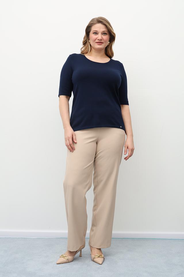 Модель имеет приталенный силуэт и круглый вырез горловины, а также короткие рукава, что делает ее идеальным вариантом для создания повседневных образов.
