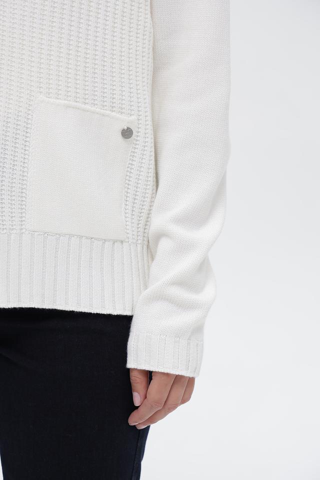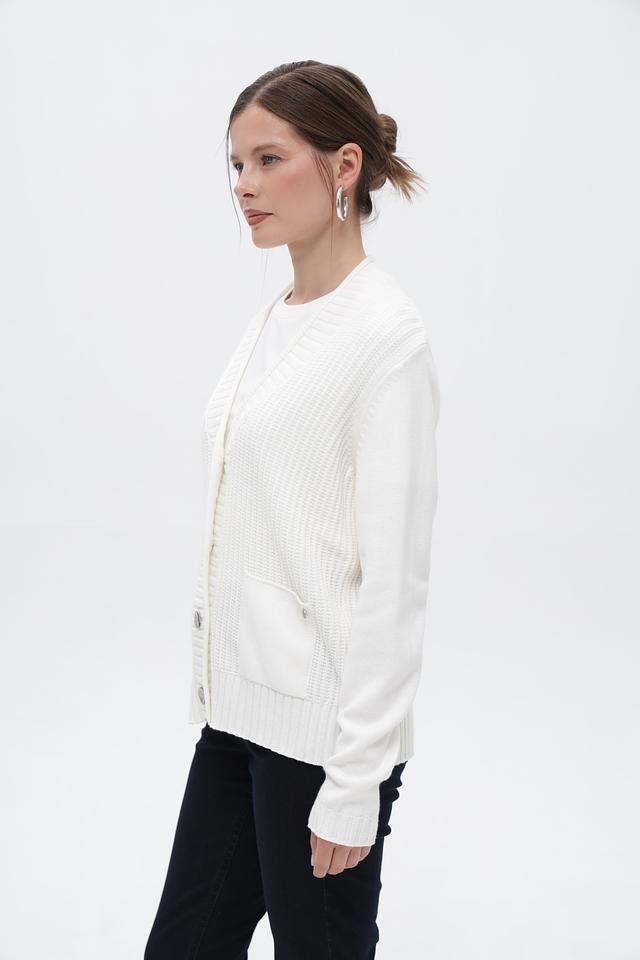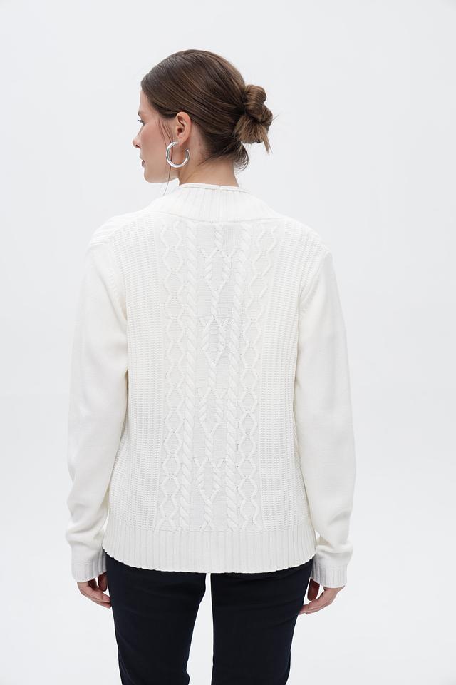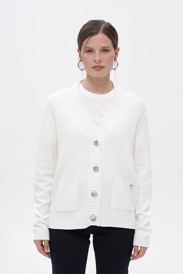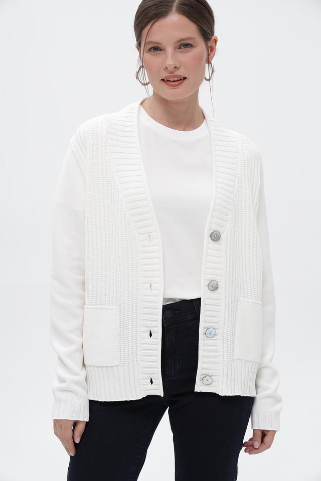Жакет дополнен двумя накладными карманами. Рукава длинные, манжеты и нижняя кромка выполнены из резинки. Текстурный узор вязки придает изделию особый шарм. Этот жакет идеально подойдет для создания комфортных и стильных образов в прохладную погоду.