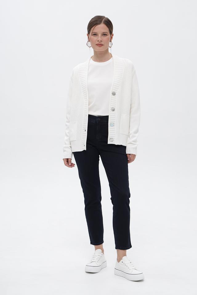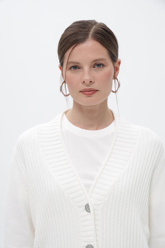 Модель выполнена из мягкой и приятной на ощупь смеси модала, полиакрила и полиамида (46%, 40%, 14% соответственно). Вязаный кардиган имеет V-образный вырез и застегивается на пуговицы.