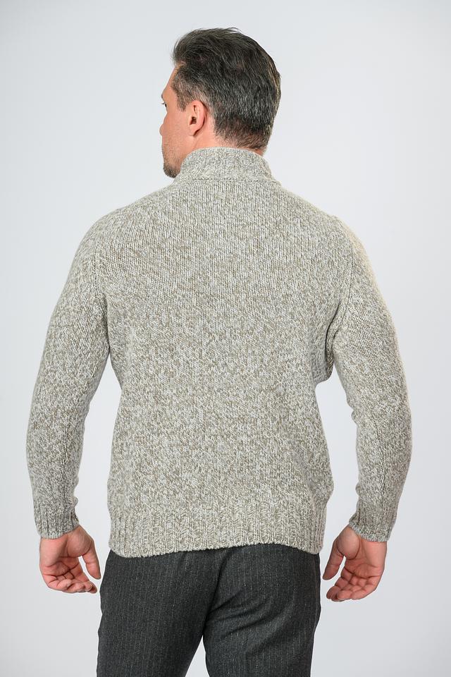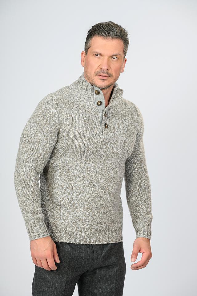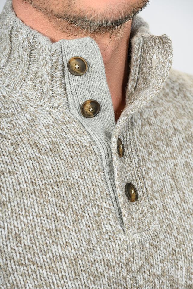 Пуловер оснащен воротником стойкой и застежкой на три пуговицы, выполненными в коричневом цвете. Рукава и нижний край изделия имеют резинку, обеспечивающую плотное прилегание. Текстура вязки – крупная, рельефная, что добавляет изделию объём и фактурность.