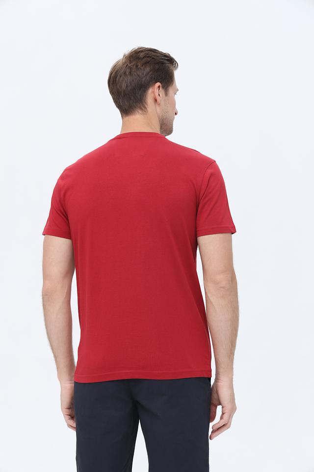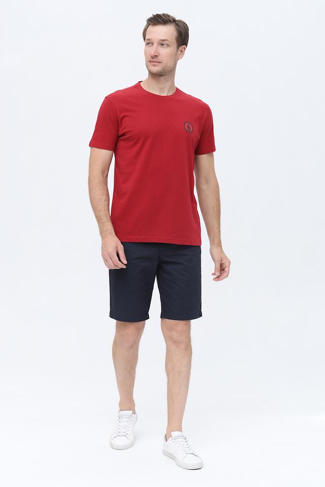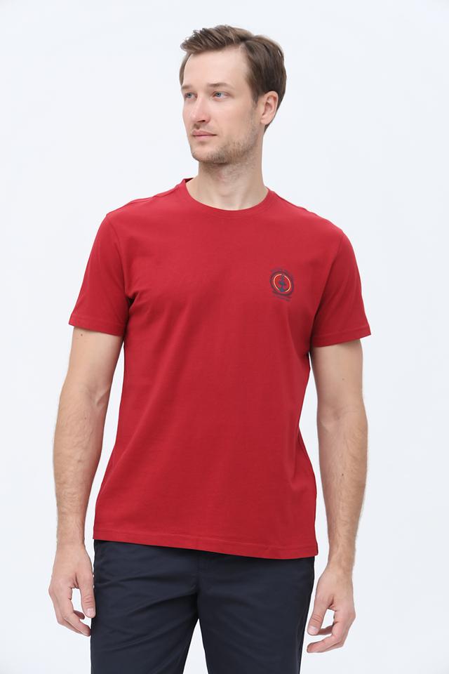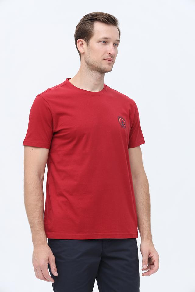 Основной цвет футболки – насыщенный красный. На груди расположена небольшая эмблема бренда, выполненная в тон изделия. Круглый вырез горловины и короткие рукава делают эту футболку идеальным выбором для теплой погоды.