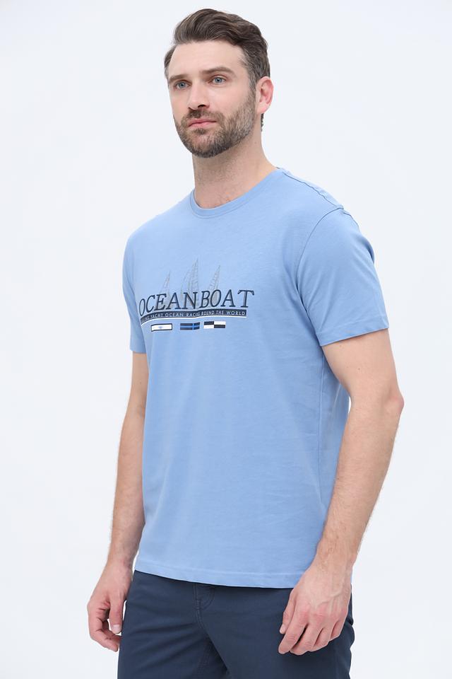 Основной цвет футболки – голубой. На передней части изделия расположен принт с надписью "Ocean Boat" и изображением флагов. Принт выполнен в тёмно-синем цвете с добавлением белых и красных элементов.