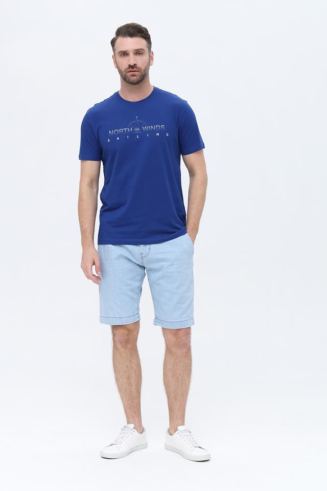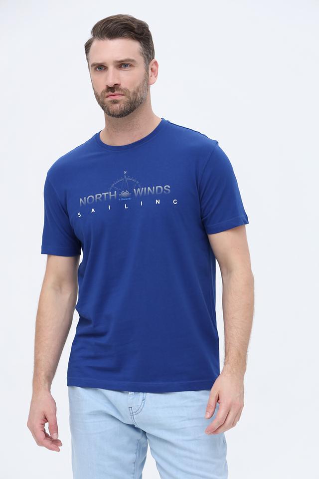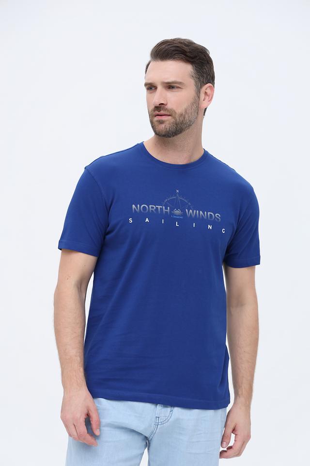 Футболка имеет классический прямой крой, который подходит для любого типа фигуры. Особое внимание привлекает оригинальный принт на груди с изображением компаса и надписью "NORTH WINDS SAILING", добавляющий образу стильный акцент.