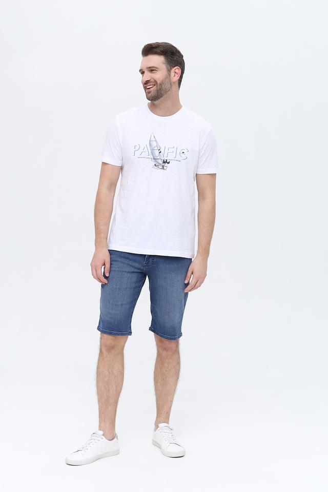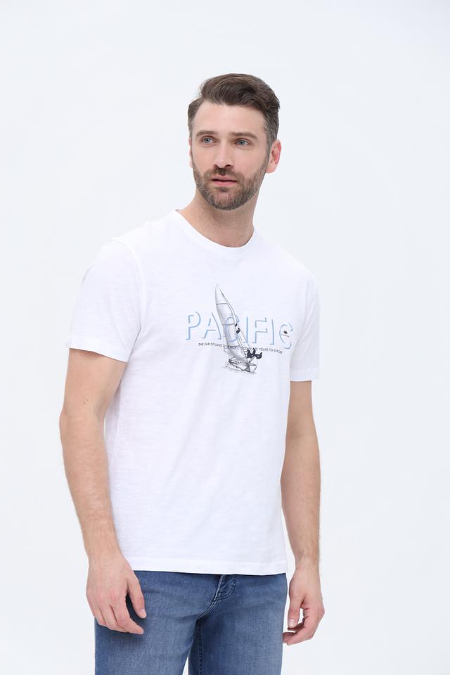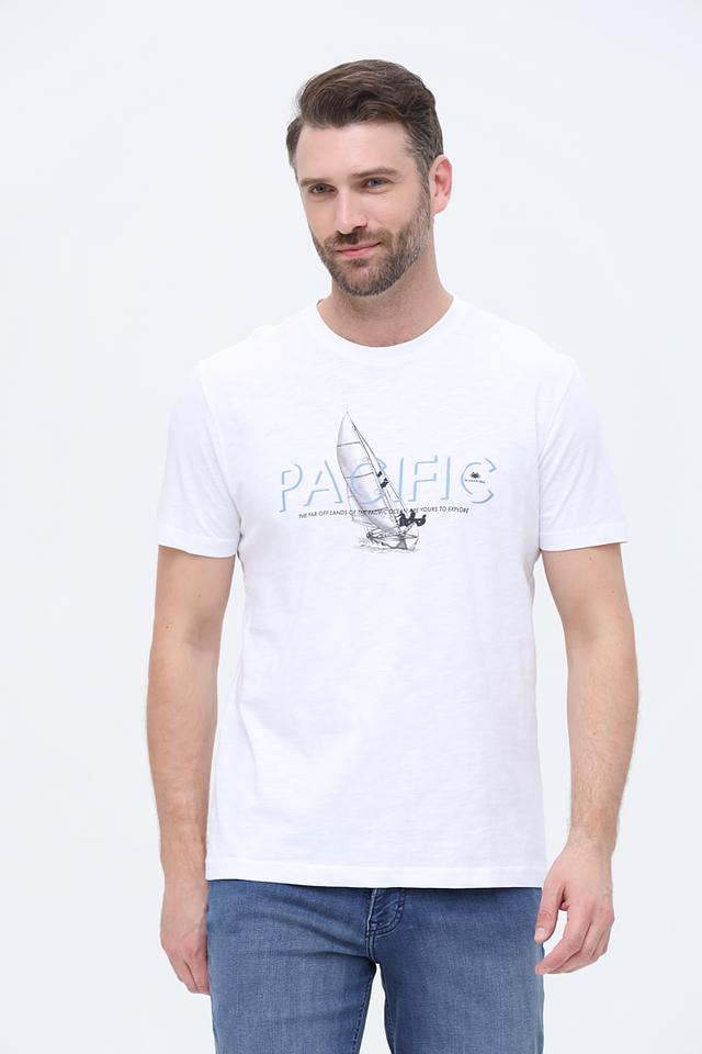 Особенностью данной модели является яркий принт Pacific, изображающий парусник на фоне морского пейзажа. Этот принт добавляет футболке индивидуальности и стиля.