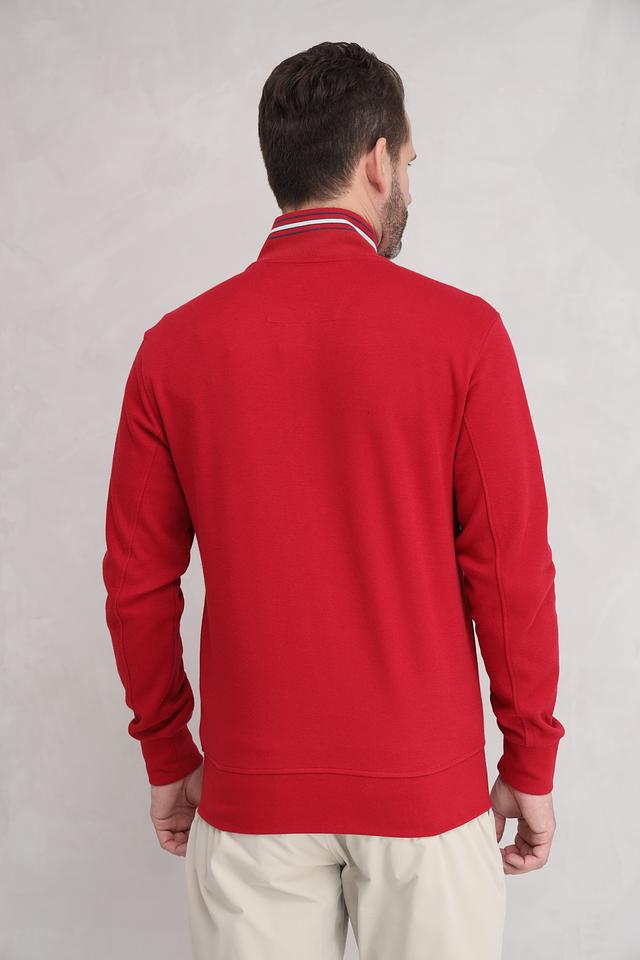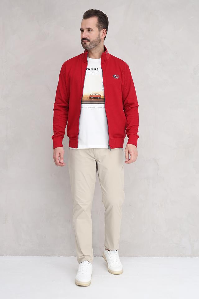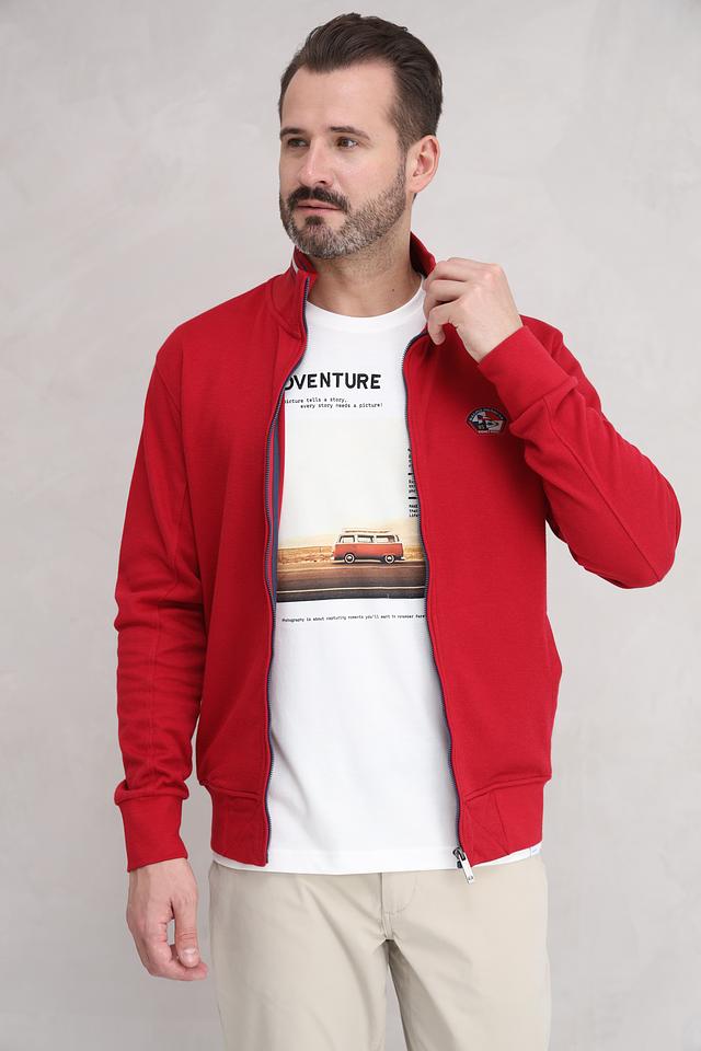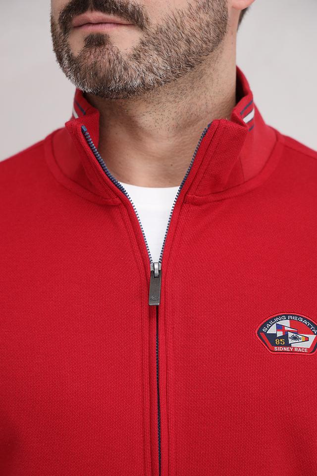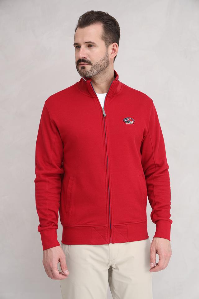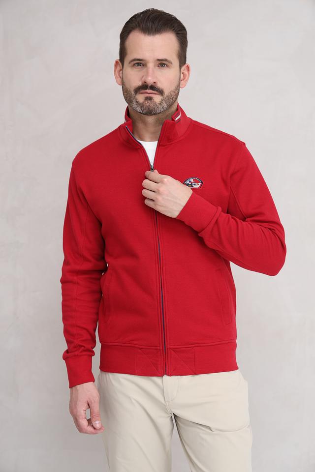Мужской кардиган Granchio насыщенного красного цвета с принтом и контрастной отделкой. Модель на молнии с высоким воротником, украшенная нашивкой с логотипом бренда. Состав: хлопок 97%, эластан 3%