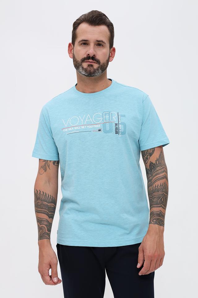 Футболка имеет голубой цвет и украшена ярким принтом "Voyager", который добавляет ей индивидуальности. Прямой крой обеспечивает свободу движений, а короткий рукав делает ее идеальной для теплой погоды.