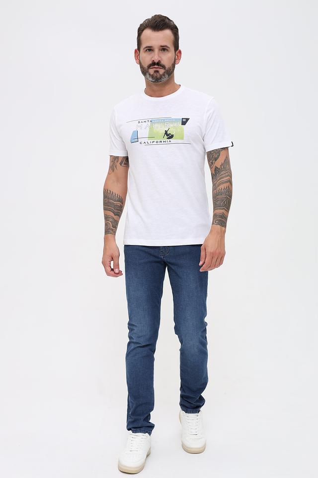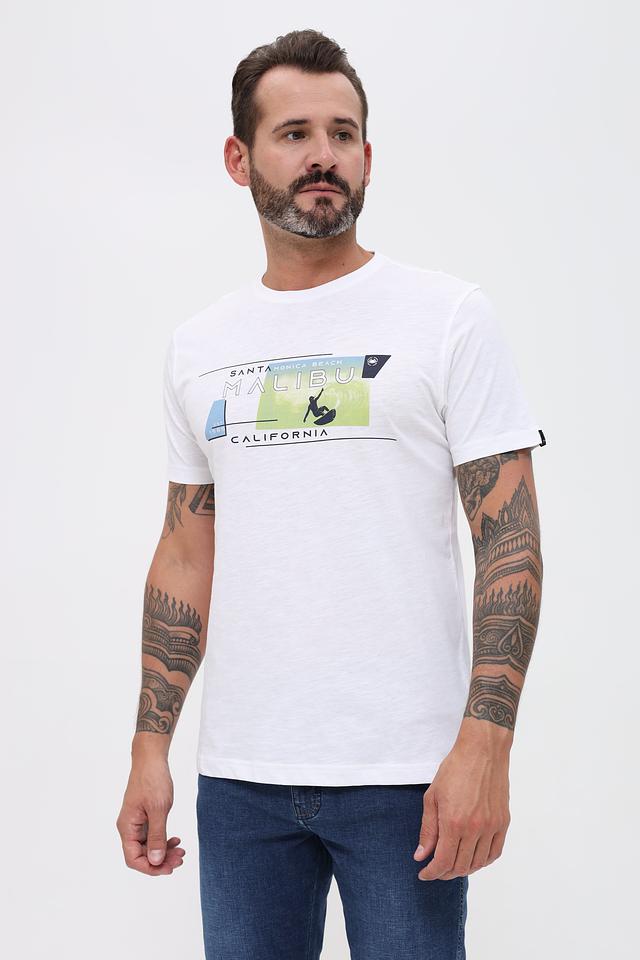 Белая футболка Granchio с ярким принтом Malibu. Изготовлена из 100% хлопка, обеспечивая комфорт и воздухопроницаемость. Стильный дизайн с изображением пляжа и серфера добавит образу непринужденности. Состав: хлопок 100%