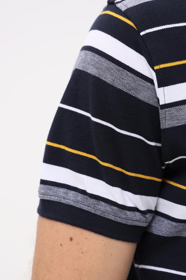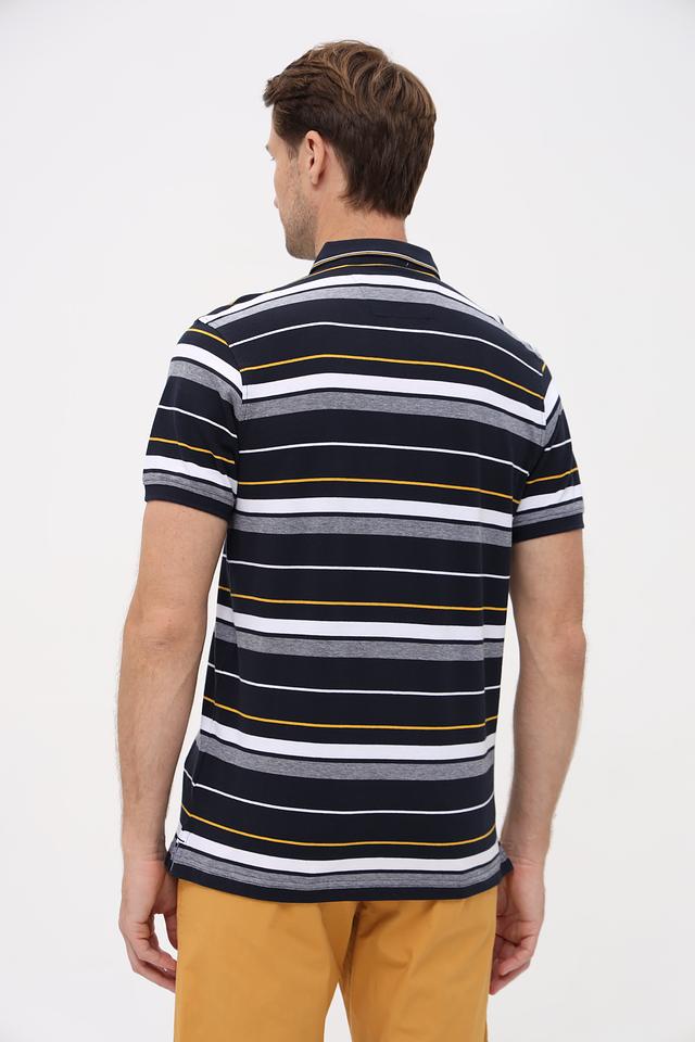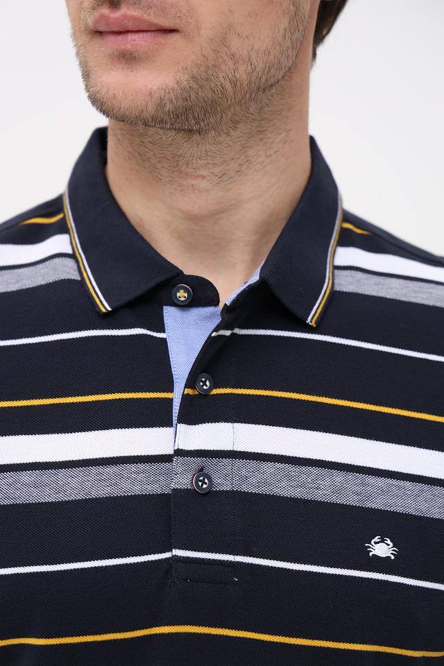Мужское поло от бренда Granchio выполнено в классическом стиле с ярким полосатым принтом. Основной цвет – синий, дополненный белыми, серыми и горчичными полосами.