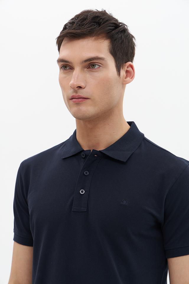Поло имеет тёмно-синий цвет, который легко сочетается с различными элементами гардероба. Воротник и планка с тремя пуговицами выполнены в тон основной ткани. На груди расположен небольшой логотип бренда, добавляющий изделию узнаваемость.